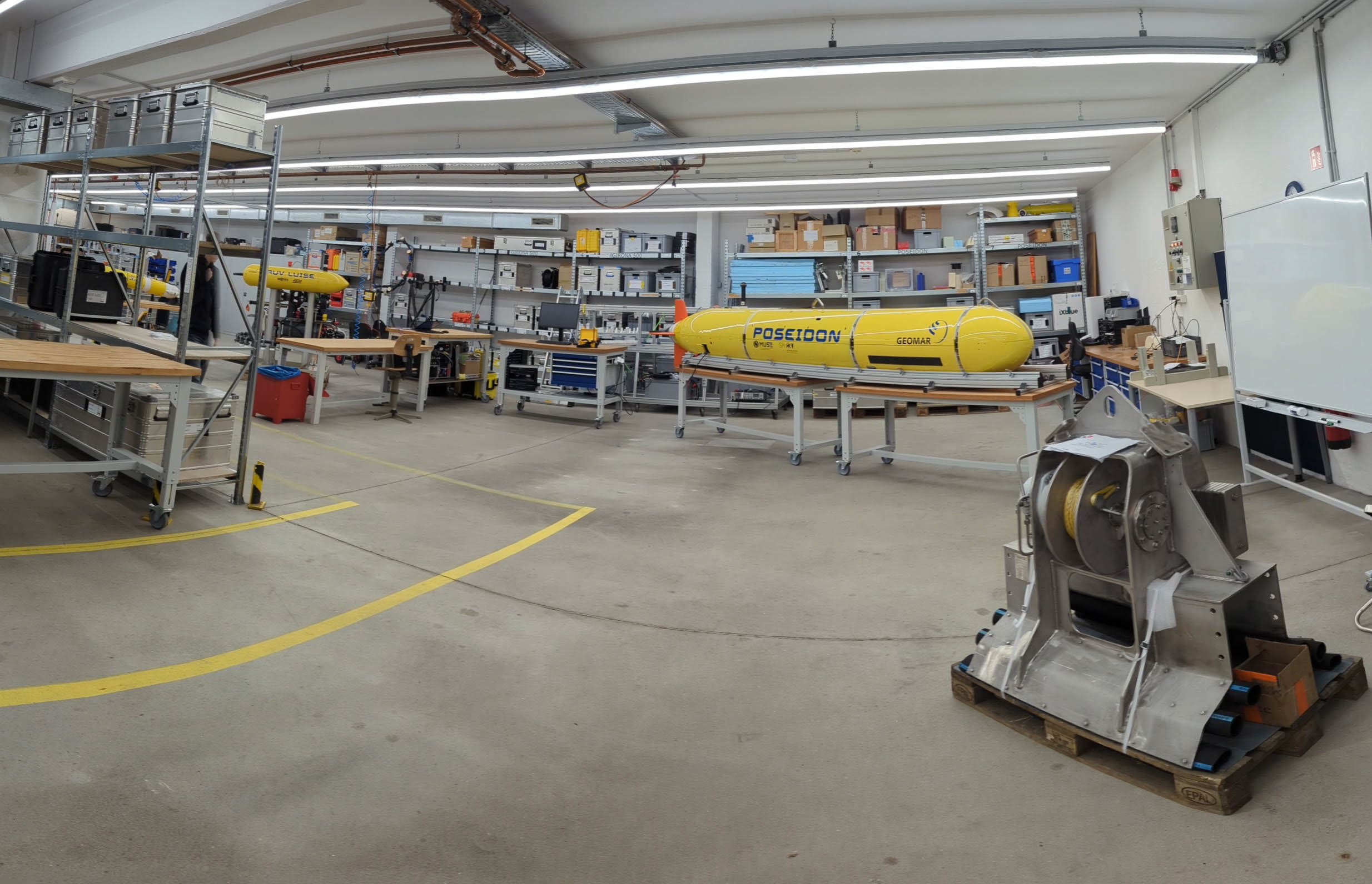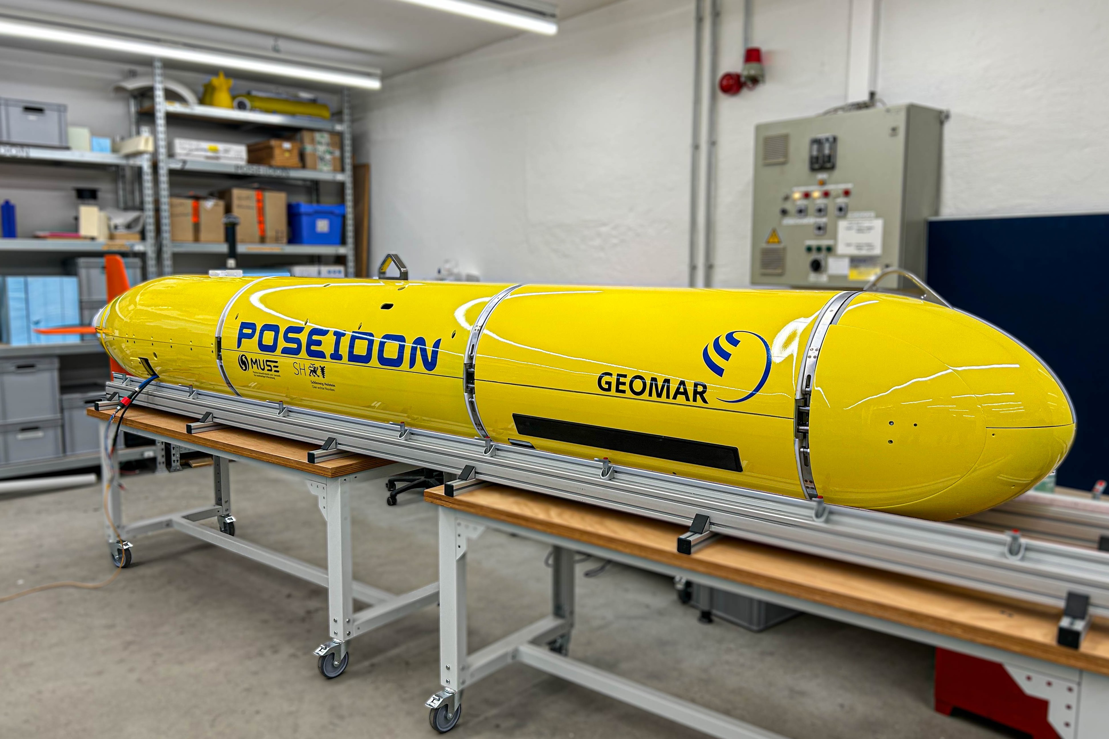 The AUV POSEIDON, like the AUV ABYSS, is designed for medium and larger research vessels. It can be launched both laterally and from the aft deck, and deployment and transport will be container-based. Unlike many underwater vehicles, which mostly have a titanium chassis, here the frame is made of a plastic shell into which a frame structure made of polypropylene is bolted. The inner part of the segments is modular in order to be able to connect different sensors and components. Due to this modular construction, AUV POSEIDON, unlike AUV ABYSS, can carry almost any scientific payload, including those with increased space requirements, such as sampling payloads. In addition, these payload segments can be replaced at sea with comparatively little effort.