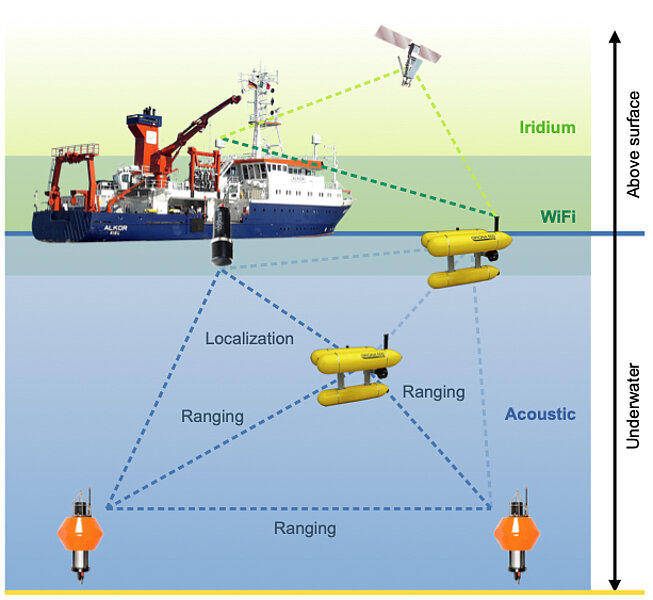 The Evologics USBL acoustic modem can be used to determine the position of a platform underwater. The USBL modem on the vessel sends a signal to the modem on the platform whose position is to be determined and the modem on the platform responds to the message. Based on the direction from which the response came and the time that has elapsed since the signal was sent, the position of the platform can then be calculated. This position determination by "pinging" a modem is possible for all platforms that have an Evologics modem for the appropriate frequency range.