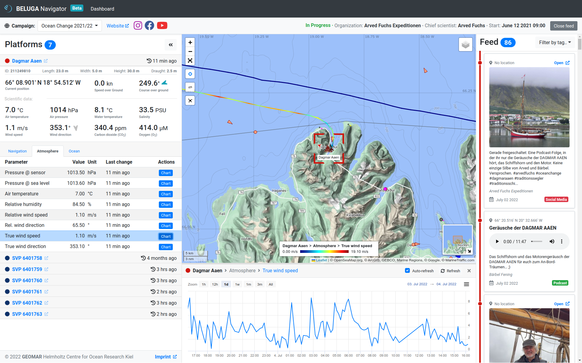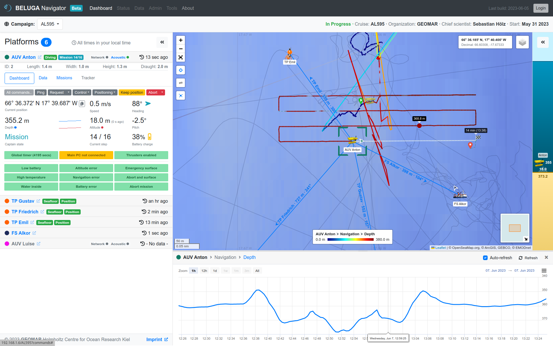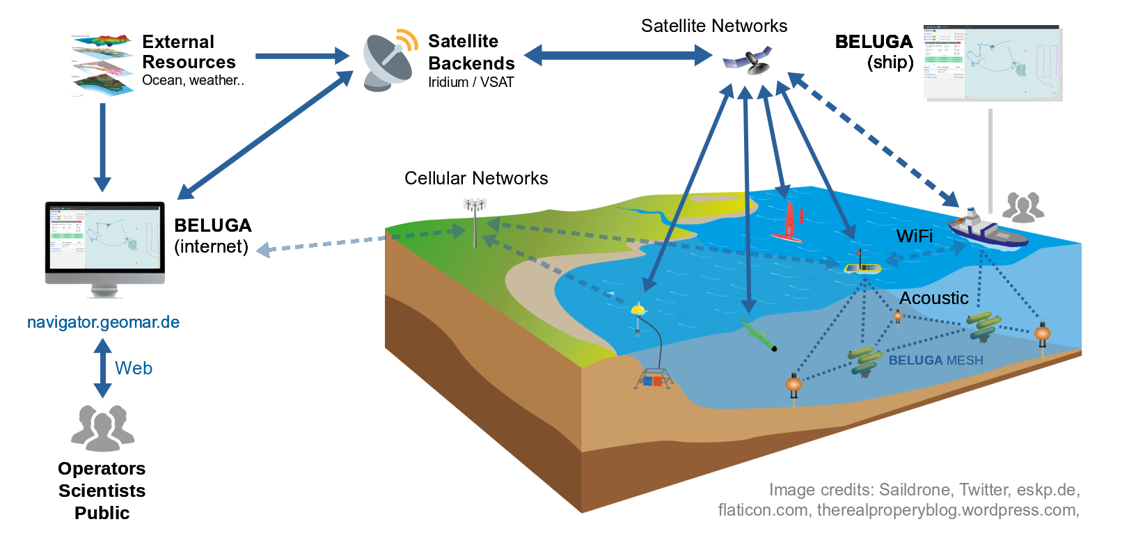 BELUGA is a system for displaying and monitoring platforms and their measurement data during operations at sea in real time. Data received from the platforms is displayed with positions via a user interface (BELUGA Navigator). Data can be displayed directly on board and also made available in an interface that can be viewed online in near real time. In addition to the visualization of data, BELUGA can be used to communicate with platforms above and below the water.