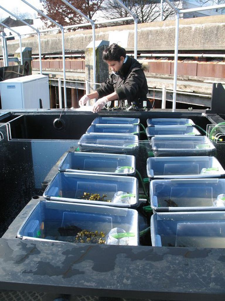 Um nun herauszufinden, ob das empfindliche System der Abwehrstoffe von Umweltveränderungen beeinträchtigt werden kann, setzten die Wissenschaftler Blasentang aus der Ostsee in kontrollierten Klimakammern Durchschnittstemperaturen von bis zu 25 Grad Celsius aus. Andere Exemplare hielten sie in offenen Versuchsanlagen auf Pontons in der Kieler Förde, Benthokosmen genannt. „Mit Hilfe spezieller Folien habe wir dort verschiedene Lichtbedingungen geschaffen – von normalen Tageslicht ohne Änderungen bis hin zu dauernder Dunkelheit“, erklärt Dr. Florian Weinberger vom GEOMAR, Co-Autor der aktuellen Studie.