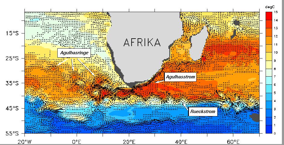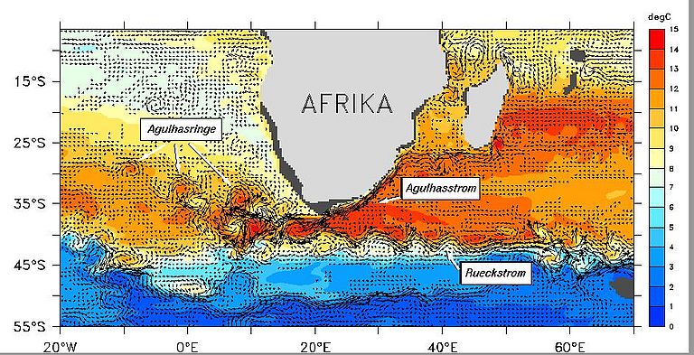 Nach Umrundung des Kaps Agulhas (der im Gegensatz zum Kap der Guten Hoffnung eigentlichen Südspitze Afrikas) vollzieht der Agulhasstrom eine abrupte Kehrtwende und fließt nach Osten in den Indischen Ozean zurück [1]. Die genaue Physik dieser im Ozean einmaligen Verhaltensweise ist das Forschungsgebiet Kieler Ozeanographen.