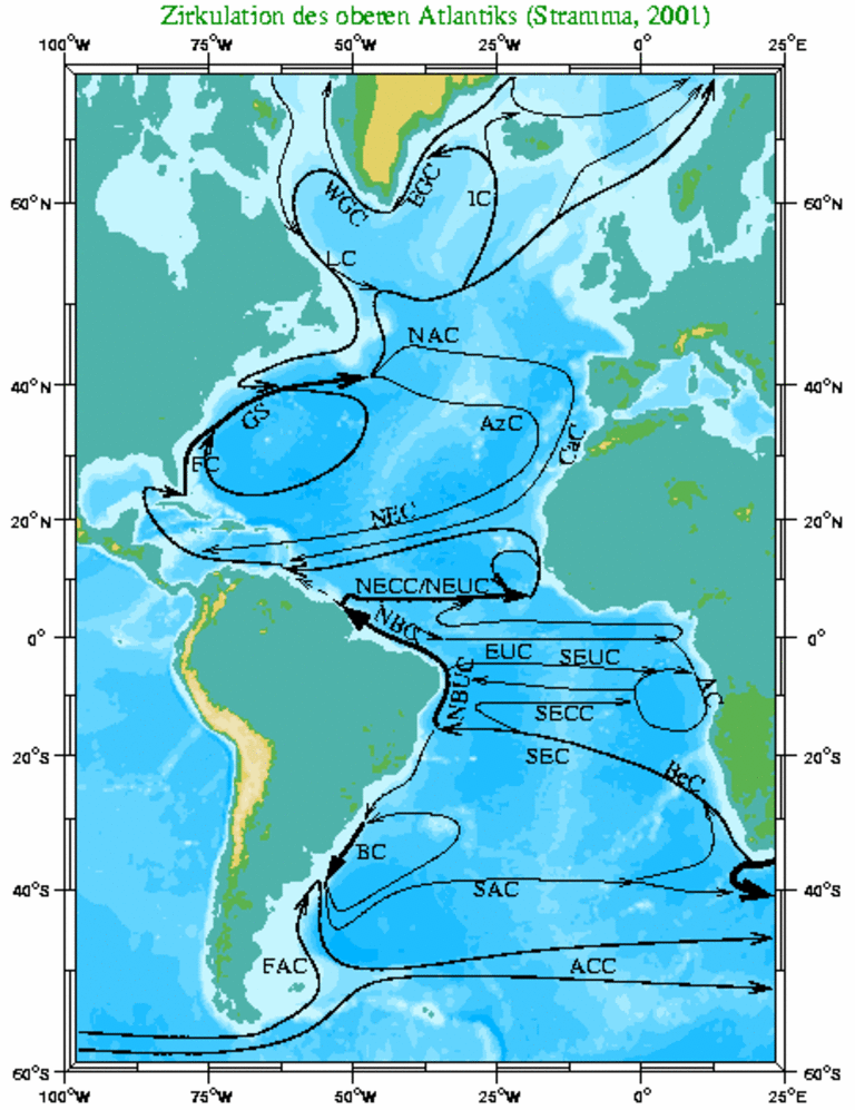 GEOMAR Helmholtz-Zentrum für Ozeanforschung Kiel eine Reihe großer meeresphysikalischer Messkampagnen im Atlantischen Ozean durch. Dabei wurden umfangreiche neue Erkenntnisse zum Verlauf der atlantischen Meeresströmungen gewonnen. Der für Europa wichtigste ist der warme, von der Karibik in unsere Breiten fließende, Golfstrom. Der derzeitige Kenntnisstand der großräumigen Zirkulation im Atlantik wurde jetzt von Lothar Stramma in einer Übersichtsarbeit zusammengefasst.