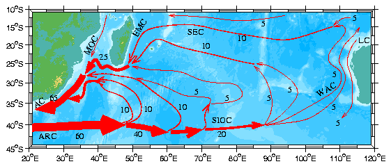 Im südlichen Teil des subtropischen Indischen Ozeans wurden bisher nur wenige hydrographische Messungen durchgeführt. Entsprechend vage war das Bild der dort herrschenden Ozeanzirkulation. In einer Zusammenfügung der existierenden Daten verschiedener hydrographischer Messkampagnen der letzten Jahre wurden Verlauf und Massentransporte der Meeresströmungen in den obersten Tausend Metern der Wassersäule untersucht, um ein besseres Bild der großräumigen Meeresströmungen zu erhalten.