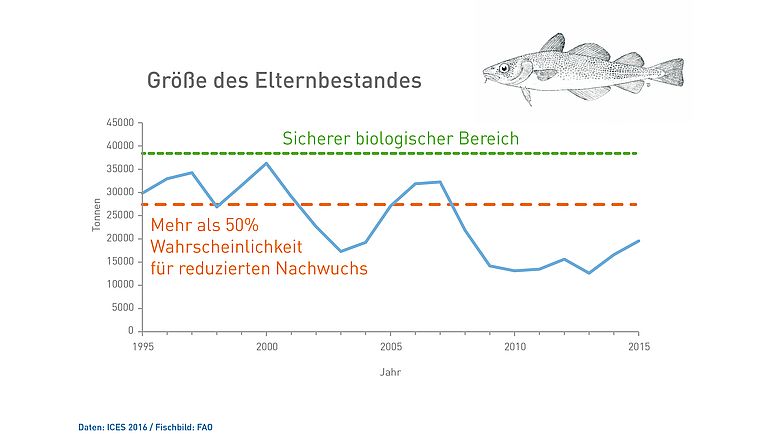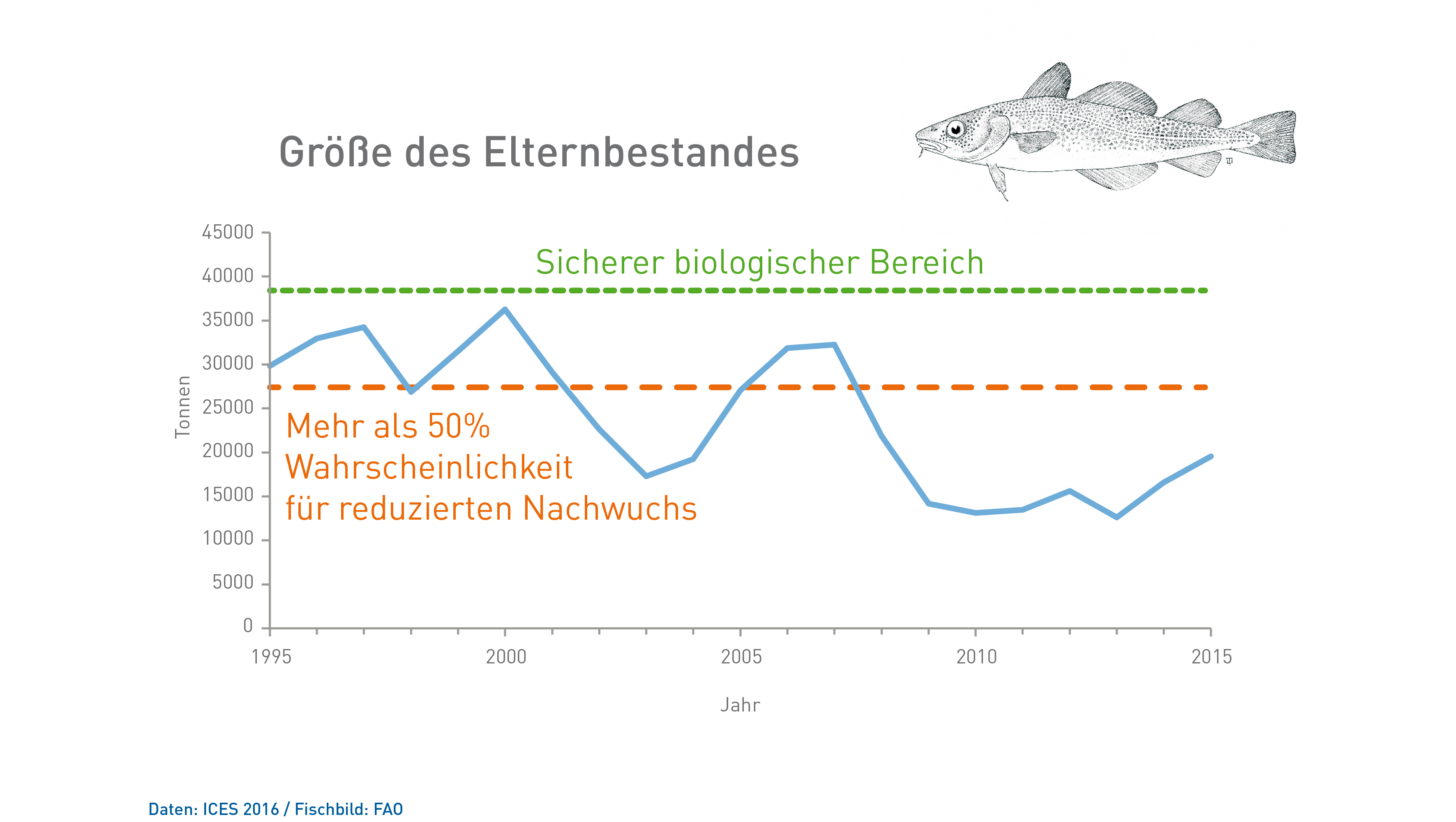 Die langjährige Überfischung hat dazu geführt, dass sich der Dorschbestand in der westlichen Ostsee seit Jahren außerhalb sicherer biologischer Grenzen befindet. Der Elternbestand ist derzeit so klein, dass eine normale Nachwuchsproduktion gefährdet ist. Bereits seit 2009 besteht eine mehr als 50-prozentige Wahrscheinlichkeit, dass der Nachwuchs beeinträchtigt ist oder sogar ausbleibt. Ökosystemmodelle des GEOMAR zeigen bereits seit Jahren einen Mangel an Jungdorschen.