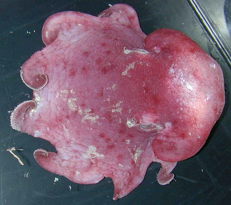 Unter den vielen verschiedenen Krakenformen war der im freien Wasser lebende Cirroctopus glacialis ein besonders auffälliger Vertreter (Abb. 7). Es war der einzige Krake, der sich durch eine deutliche Flossenbildung auszeichnet. Durch seine violette Färbung und die gallertige Körpermasse ist unschwer abzuleiten, dass diese Art eine Tiefenwasserform ist, die nur gelegentlich in den oberen Wasserschichten anzutreffen ist. Über die Biologie und Lebensweise dieses Tieres gibt es bisher nur Spekulationen.