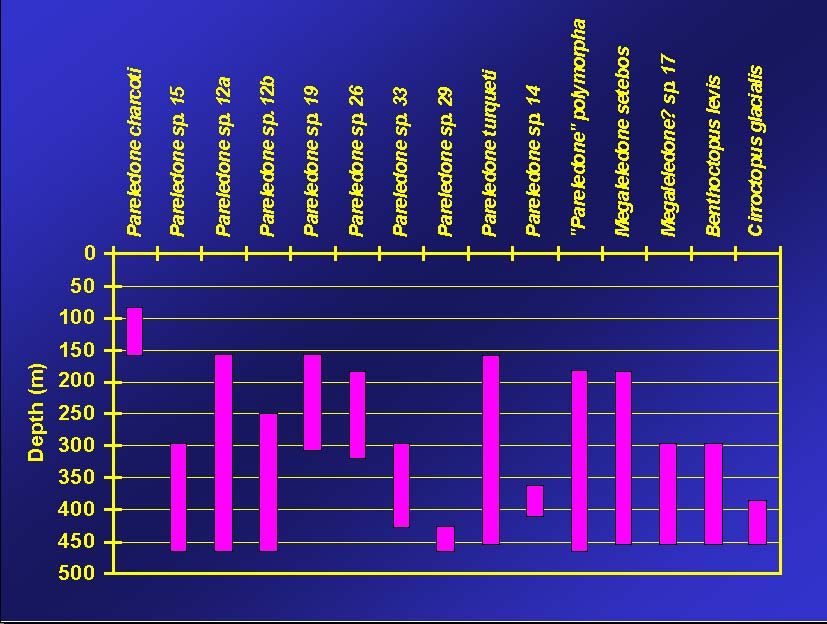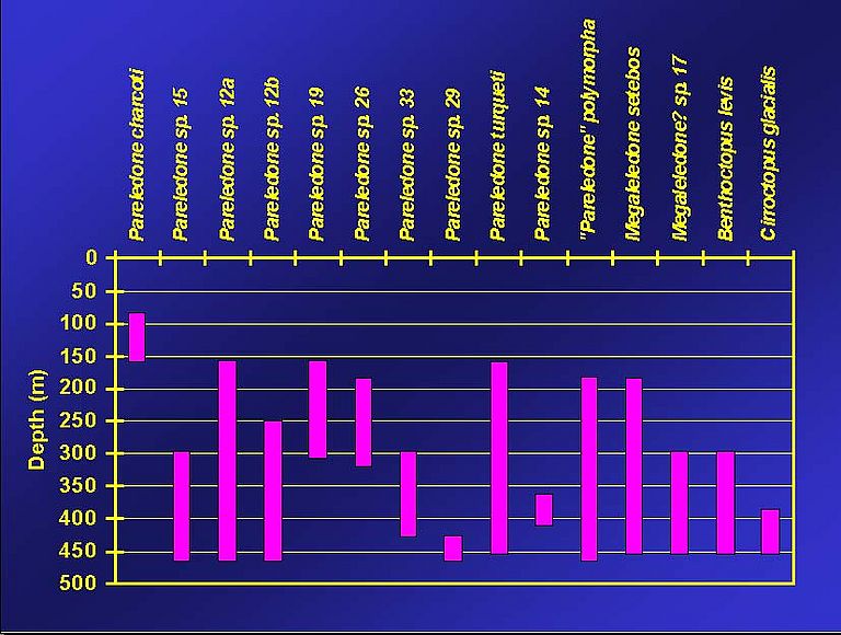 Neben den weiterführenden taxonomischen Arbeiten werden die genauen Verbreitungsmuster der Kraken im Untersuchungsgebiet detailliert beschrieben. Erste Ergebnisse zeigen, dass die Kraken im Gebiet um Elephant Island weitaus häufiger auftraten als in den angrenzenden Gebieten an der Antarktischen Halbinsel. Wegen der starken Überfischung der Fischbestände in den Küstengewässern um Elephant Island in den 1970ern und 1980ern durch internationale Fangflotten ist zu vermuten, dass zumindest einige Kraken-Arten hier seither eine Position im Schelfökosystem eingenommen haben, die vor wenigen Jahren noch von den kommerziell bedeutenden Fischarten besetzt war. Interessant ist in diesem Zusammenhang auch die Tiefenverteilung der Kraken (Abb. 6). Dabei zeichnen sich deutliche Präferenzen für bestimmte Wassertiefen ab. Dem antarktischen Warzenkraken als ausgewiesene Flachwasserform kommt hier wiederum eine entscheidende Rolle zu.