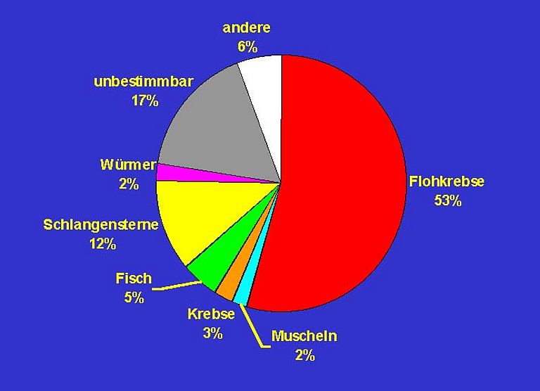 Eine wesentliche Forschungsaufgabe während der Expedition bestand in der Analyse des Beutespektrums der gefangenen Kraken. Viele Informationen existieren über die Bedeutung der Kraken als Beute für Robben und Seevögel, aber nichts ist bekannt über ihre eigenen Fressgewohnheiten. Im Laufe der Expedition wurden deshalb etwa 400 Kraken der häufigsten Arten seziert und ihre Mageninhalte genauer analysiert. Dabei wurden für die Wissenschaft völlig neue Ergebnisse gewonnen: Flohkrebse und Schlangensterne waren ihre häufigsten Beutetiere (Abb. 8). Somit wird klar, dass die hohe Anzahl an Kraken im Untersuchungsgebiet einen entscheidenden Fraßdruck auf die bodenlebenden Tiere, das sogenannte Benthos, ausübt.