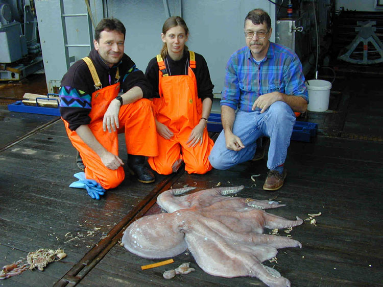 Zur großen Freude nicht nur der eingefleischten Teuthologen - das sind Tintenfischforscher - gelang auch der Fang des bisher größten antarktischen Riesenkraken (Megaleledone setebos). Mit einem Gesamtgewicht von über 27 Kilogramm war der Fang dieses Tieres ein besonderes Highlight der gesamten Expedition (Abb. 4).