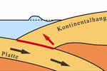 einem Kontinent gehört (kontinentale Platte) und die andere zum Meeresboden (ozeanische Platte), führt die höhere Dichte der ozeanischen Platte dazu, dass sie sich unter die weniger dichte kontinentale Platte schiebt. Dabei wird ozeanische Kruste „verschluckt“, das heißt dem Erdmantel zugeführt. Dieser Prozess wird Subduktion genannt. Die Subduktionszonen befinden sich in den Tiefseegräben, die bis Tiefen von bis zu 11.000 Metern erreichen.
