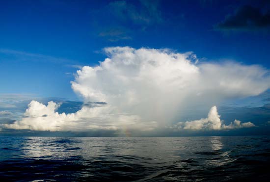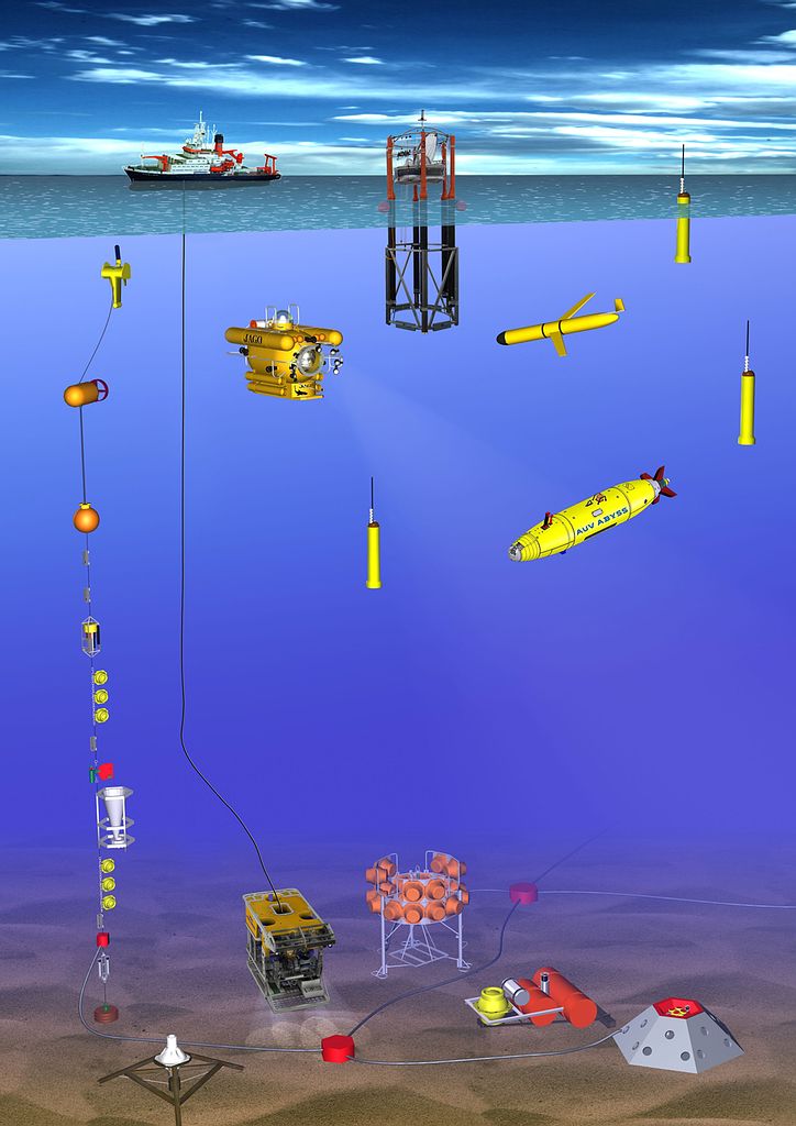 Zurück zum „großen Ganzen“, zum Weltmeer, zum Ozean. Das Weltmeer umgibt heutzutage mehrere Kontinente deshalb gibt es auch mehrere Ozeane. Offiziell gibt es den Atlantischen, Pazifischen, Indischen und den Arktischen Ozean. Für diese Namensgebung ist die „Internationale Hydrographische Organisation“ mit Sitz in Monaco zuständig. Wissenschaftler unterscheiden zudem noch den Südlichen Ozean, der das einzigartige Meeresgebiet um die Antarktis bezeichnet. Wie auch immer aufgeteilt und benannt, die Ozeane bedecken mehr als zwei Drittel der Erdoberfläche. An wenigen Stellen sind sie tiefer als 10.000 Meter und im Mittel „nur“ 3.500 Meter tief. Daraus ergibt sich ein gewisse Missverhältnis zwischen Breite und Tiefe. Würde man die Ozeanfläche im Seitenverhältnis eines DIN-A4 Papiers aufteilen so wäre das „Weltmeer Blatt“ weniger als halb so dick wie ein Blatt Standard-Druckerpapier. Das ändert nichts daran, dass das Ozeaninnere für Menschen nur schwer erreichbar ist. Die unvorstellbare Größe, der hohe Druck in der Tiefe, Korrosion des Salzwassers und nicht zuletzt das manchmal schlechte Wetter machen Ozeanforschung zu einer echten Herausforderung, der nur mit High-Tech-Lösungen begegnet werden kann: Neben hochmodernen Forschungsschiffen werden ferngelenkten Tauchboote eingesetzt, die beispielsweise den Meeresboden genau vermessen. Stahlseile werden auf dem Meeresboden verankert und von mit Luft gefüllten Glaskugeln zur Meeresoberfläche hin aufgerichtet. An den Seilen werden für Monate oder Jahre Instrumente montiert, die Daten über Strömungen, Salzgehalte, Wassertemperaturen oder die Chemische und Biologische Zusammensetzung des Wassers sammeln.