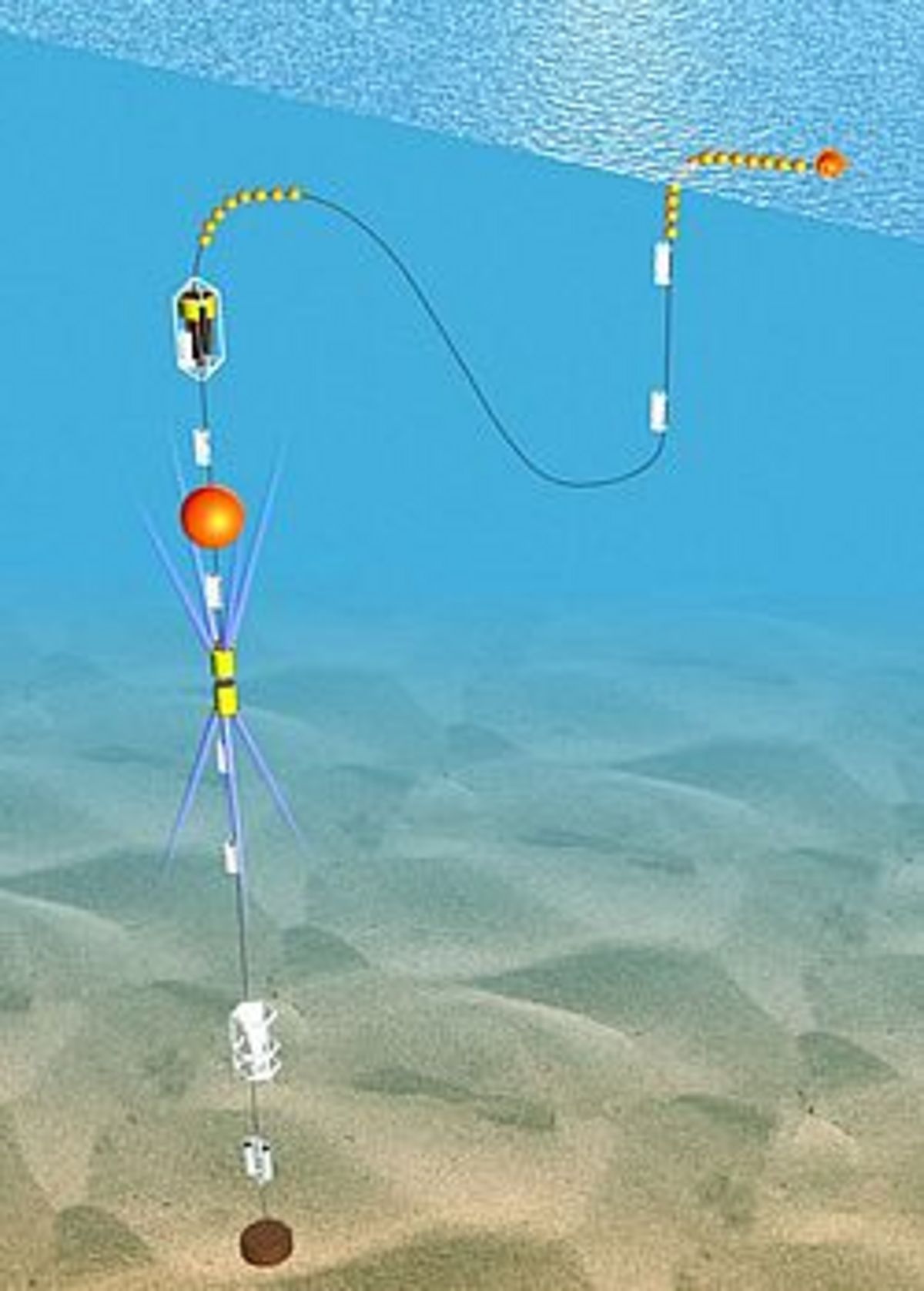 Aufgezogen wie an einer Perlenkette, sicher auf dem Meeresboden platziert - Verankerungen können eine ganze Menge an Sensoren und Messgeräten beinhalten. Die Grafik zeigt beispielhaft, wie das aussehen kann: Ganz unten befindet sich ein Grundgewicht, das dafür sorgt, dass die Verankerung auf dem Boden stehen bleibt. Darüber befindet sich der aktustische Auslöser: Durch ein Schallsignal, das vom Schiff gesendet wird, löst er aus, sodass die Verankerung sich löst und an die Wasseroberfläche treibt. Zu diesem Auslöser gehört übrigens auch der zerdrückte Stahlzylinder im Cubus von Schleswig-Holstein. Der Druck in der Tiefsee ist so groß, dass die Geräte ihm nicht immer standhalten, wenn sie zum Beispiel durch leichte Beschädigungen nicht mehr ganz intakt sind. Für den Auftrieb sorgen die gelben und orangenen Kugeln am oberen Ende der Kette: Durch sie ist auch sicher gestellt, dass die Verankerung aufrecht im Wasser steht. Dazwischen befinden sich diverse Messgeräte und Sensoren. Sie umfassen zum Beispiel physikalische Sensoren zur Messung der Wassergeschwindigkeit (gelb) und der Temperaturen und Salzgehalte (silbergrau). Durch einen Klick auf die Grafik werden die einzelnen Bauteile mit Fotos noch einmal genauer erklärt.