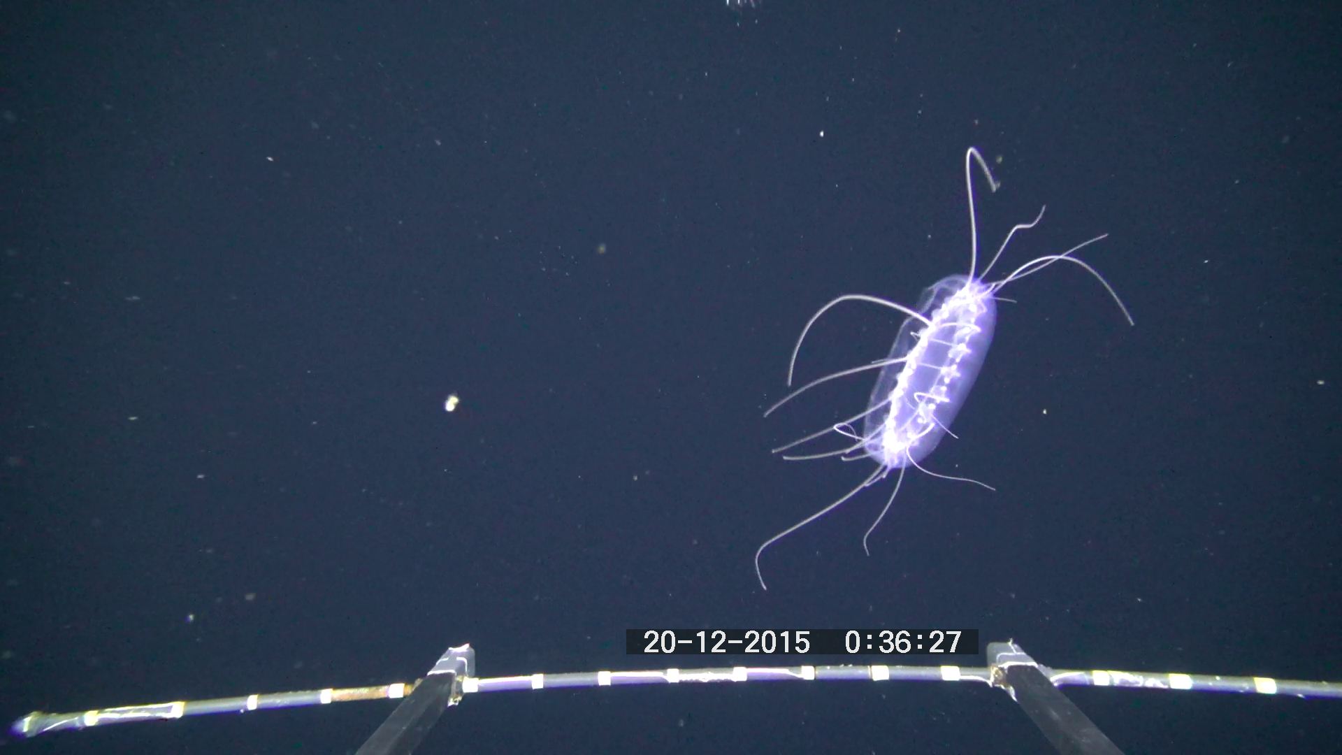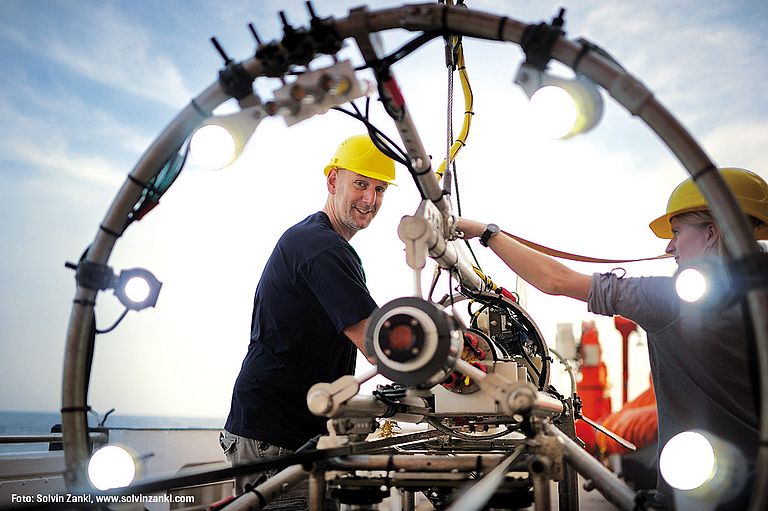 Das Foto von Naturfotograf Solvin Zankl entstand während der Expedition MSM49 mit der MARIA S. MERIAN im östlichen tropischen Atlantik. Es zeigt den Wissenschaftler Dr. Henk-Jan Hoving bei der Vorbereitung von PELAGIOS vor dem nächsten Aussetzen. Während der Fahrt wurde mit dem Kamerasystem der Einfluss von Sauerstoffminimumzonen auf die Anzahl und die Verteilungsmuster der im freien Wasser lebenden Organismen untersucht. Gerade das gelatinöse Plankton ist dafür bekannt, in genau dieser für die meisten anderen Tiere feindlichen Umgebung zu leben. Es entstanden ca. 80 Stunden Filmmaterial auf welchem eine Vielzahl von Organismen ab einer Größe von einem Zentimeter abgebildet sind.