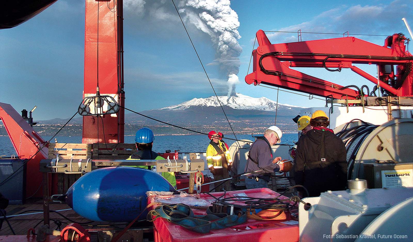 Vulkanausbrüche, Mega-Erdbeben, Tsunamis – nach den Erfahrungen der vergangenen Jahre verortet man solche Naturkatastrophen meist an den Küsten des Pazifischen oder Indischen Ozeans. Doch so weit muss man nicht reisen, um die Dynamik der Erde in ihrer ganzen Pracht und Gefährlichkeit zu erleben. Unser Bild des Monats August zeigt den Ätna auf Sizilien, den größten aktiven Vulkan Europas. Gerade als Kieler Meeresforscher Anfang 2012 vor der Küste Siziliens vom Forschungsschiff METEOR aus Spuren vergangener Naturkatastrophen am Meeresboden untersuchten, zeigte der Feuerberg eindrucksvoll seine Macht. Zum Glück war dieser Ausbruch für die Bevölkerung ungefährlich.