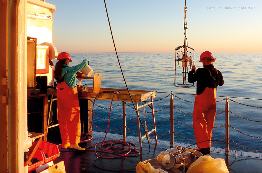 Unser Bild des Monats zeigt Arbeiten während der Ausfahrt AL521 auf dem Forschungsschiff Alkor im Bornholmbecken in der zentralen Ostsee. Seit 1986 werden von Kiel aus startend Messungen und Probennahmen in der offenen Ostsee durchgeführt. Diese Langzeitmessreihen sind dadurch eine der besten verfügbaren integrativen Datenreihen im pelagischen System, dem freien Wasser, des Randmeeres. Die Forschenden nutzen für die Datenreihe ganz unterschiedliche Messtechniken, wie hydrografische Methoden Hydrographie, die Entnahme von Plankton, die Hydroakustik und die pelagische Schleppnetzfischerei einschließlich intensiver Fischprobennahmen. Dafür arbeiten die Wissenschaftler des GEOMAR zum Beispiel zusammen mit Wissenschaftlern der University of Southern Denmark: Zu sehen ist hier beispielsweise Silvia Kollerova von der University of Denmark, die links im Bild Planktonproben für die weitere Bearbeitung im Nasslabor an Bord filtriert. Währenddessen bereitet Felix Mittermayer von GEOMAR rechts im Bild eine CTD-Sonde für den Einsatz vor. Sie hilft bei der Erstellung von Wasserprofilen durch die Bestimmung von Sauerstoffgehalt, Temperatur und Salzgehalt. Ungewöhnlich war das gute Wetter, das die gesamte 16-tägige Fahrt begleitet.