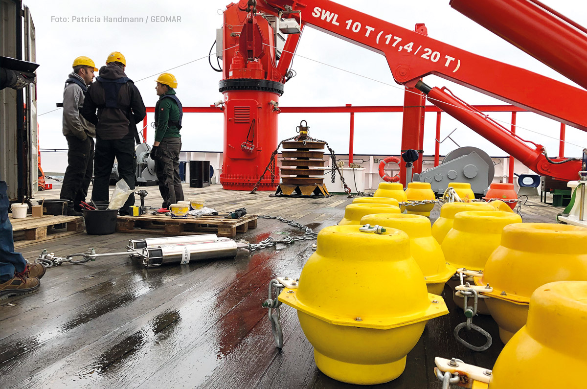 Verankerungen sind autonome Langzeitbeobachtungsstationen, die an Schlüsselpositionen der globalen Ozeanzirkulation kontinuierlich Messwerte erheben. Sie tragen dazu bei, natürliche Schwankungen im Ozean wie auch die Veränderungen durch den Klimawandel zu erkennen und zu verstehen. Seit 1997 betreibt das GEOMAR mehrere Verankerungen in der Labradorsee, dem Meeresgebiet zwischen Kanada und Grönland, um den tiefen westlichen Randstrom und die Tiefenwasserbildung als Teil der atlantischen Umwälzzirkulation kontinuierlich zu vermessen. Die Grundausstattung einer Verankerung besteht aus einem Ankergewicht am Meeresboden mit einem akustischen Auslöser und einem langen Draht, der von Auftriebskörpern in der Wassersäule aufrecht gehalten wird. An dem Draht befestigen die Wissenschaftler*innen verschiedene Messgeräte wie an einer Perlenkette. Ist die Messperiode einer Verankerung zu Ende, wird der Draht mit Hilfe eines akustischen Auslösers vom Anker getrennt, durch die Auftriebskörper gelangen Draht und Geräte wieder an die Oberfläche. An Bord werden die Daten der Messgeräte ausgelesen. Mit ausgewechselten Verschleißteilen und aufgeladenen Batterien versehen, wird die Verankerung dann erneut ausgelegt.