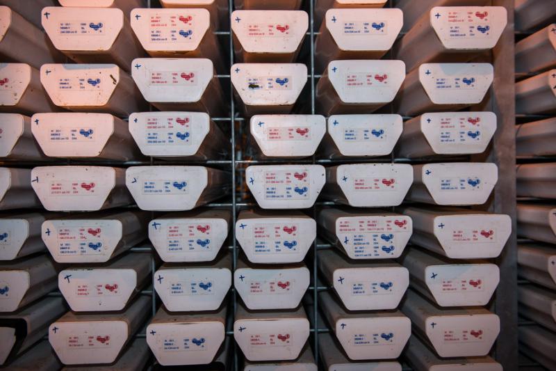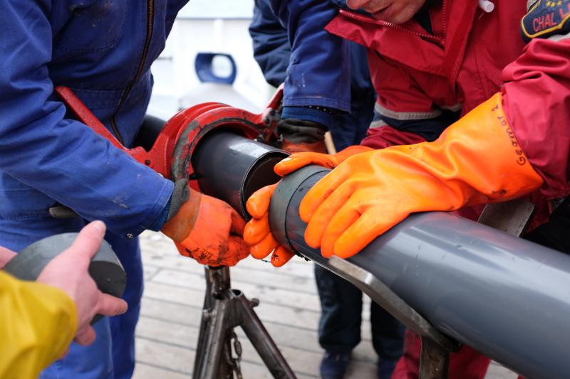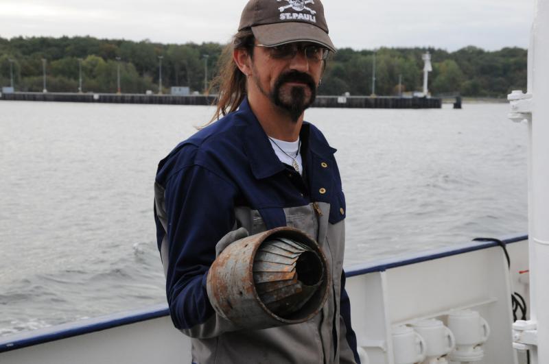 Dazu wird ein sogenanntes Schwerelot genutzt, wie es auf unserem Bild des Monats Dezember zu sehen ist. Das Schwerelot selbst besteht aus drei verschiedenen Komponenten. Zum einen ist dies ein Stahlrohr. Dieses kann bis zu 30 Meter lang sein. Wie lang das Rohr sein muss und kann, hängt zum einen von dem Meeresboden, den die Forscher untersuchen wollen, und der wissenschaftlichen Fragestellung ab. Außerdem spielt die Größe des Forschungsschiffs und der technischen Möglichkeiten an Bord eine Rolle. Auf FS POSEIDON beispielsweise kann ein bis zu zwölf Meter langes Lot gehändelt werden. In dem Stahlrohr befindet sich ein sogenannter PVC-Liner. Das ist ein Kunststoffrohr, in dem sich nach getaner Arbeit der Bohrkern befindet. Am unteren Ende ist der Liner mit einer Vorrichtung versehen, die verhindert, dass der Kern beim Hochziehen unten herausrutschen kann. Aufgrund ihres Aussehens wird diese als Apfelsine bezeichnet (siehe Bild). Das dritte Element schließlich ist ein Satz Gewichte, der sich oben auf dem Stahlrohr befindet und zwischen einer und acht Tonnen wiegt. Seine Aufgabe ist es, das Lot in den Boden zu treiben. Wie schwer das Gewicht sein muss, hängt davon ab, wie tief das Schwerelot in den Meeresboden eindringen soll. Dies ist Erfahrungssache. In einem neuen Gebiet werden deshalb oft ein paar Testkerne genommen durchgeführt, um den Reibungswiderstand des Materials auszuprobieren. Bei einem sandigen Boden beispielsweise, wie er in Küstengegenden vorkommt, ist der Widerstand höher, ein zu langes Rohr würde im Sand steckenbleiben und zur Seite kippen – der Bohrkern wäre völlig unbrauchbar. Deshalb werden in bisher unerforschten Gebieten erst einmal kürzere Rohre und weniger Gewichte verwendet.