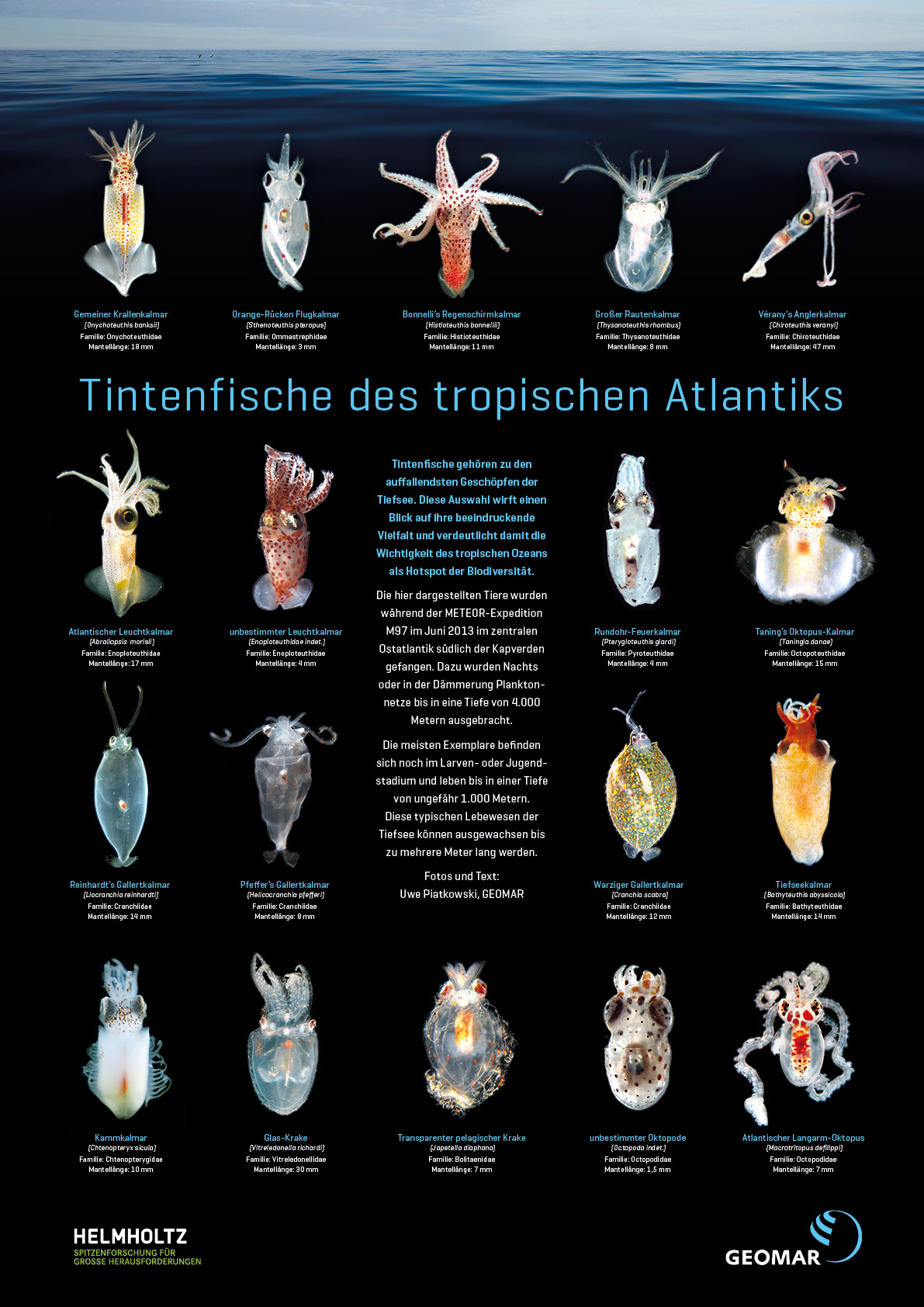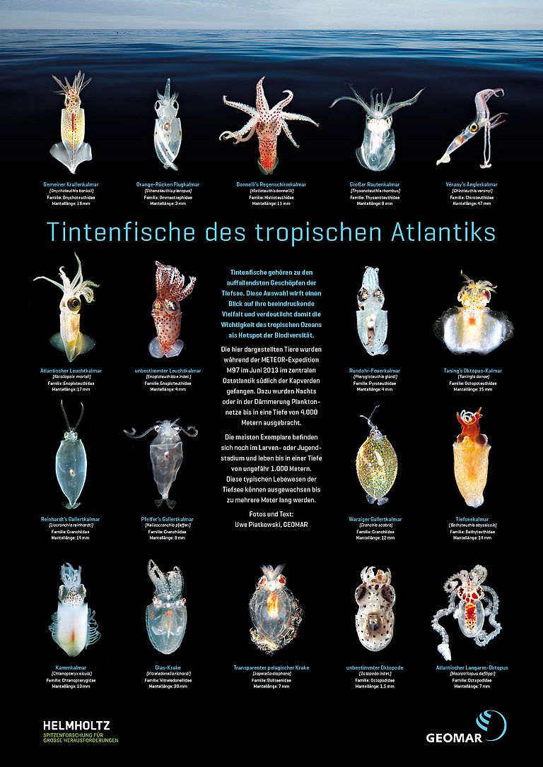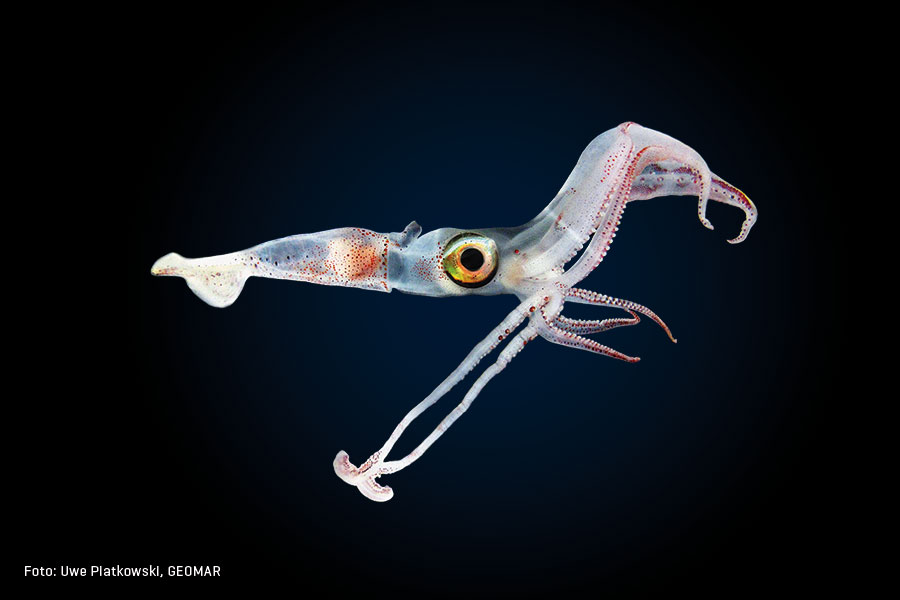 Unser Bild des Monats Februar zeigt einen Anglerkalmar. Dieser Tintenfisch heißt mit wissenschaftlichem Namen Chiroteuthis veranyi. Das Exemplar auf dem Foto wurde vor der westafrikanischen Küste während einer Forschungsfahrt des deutschen Forschungsschiffs METEOR gefangen. Dazu wurden von den Wissenschaftlern Mehrfachschließnetze eingesetzt, um in gezielten Wassertiefen Zooplankton sowie junge Fische und Tintenfische zu fangen. Der Anglerkalmar auf unserem Bild stammt aus einer Tiefe von 100-200 Metern.