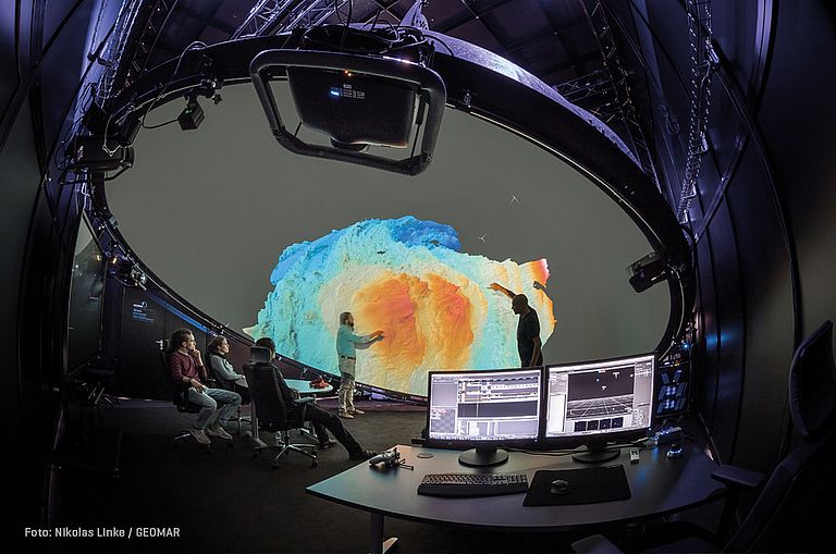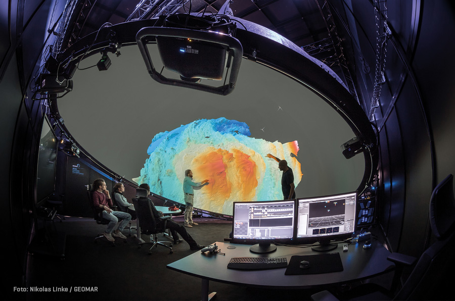 Betritt man die Lithothek, ist man umgeben von hohen Regalen gefüllt mit blauen Kisten voller unterschiedlicher Gesteinsproben. Mit diesen rekonstruieren Forscherinnen und Forscher die Geschichte unseres Planeten, untersuchen das Risiko von Vulkanismus im Meer oder auch Klimaschwankungen der Vergangenheit. Die Proben selbst sind hier akribisch sortiert, denn die Lithothek ist der zentrale Ort für die Bearbeitung von Sedimentkernen und Gesteinsproben. Doch Untersuchungen von verschiedenen Fundstücken reichen insbesondere in der Meeresbodenforschung nicht aus – auf den Kontext kommt es an. Oftmals benötigt man eine maßstabsgetreue Abbildung der Küstenverläufe, Vulkankrater oder auch Meeresströmungen, die in die wissenschaftliche Interpretation mit einfließen. Wo dies geschehen kann, zeigt unser Bild des Monats: Im hinteren Teil der Lithothek findet man einen großen schwarzen Kasten: die ARENA2, eine Art digitales Planetarium, das jedoch einige Besonderheiten aufweist. Im Inneren befindet sich eine Kuppel, auf die 360-Grad-Visualisierungen von Forschungsdaten projiziert werden. Diese Kuppel ist frei hängend und kann so in verschiedenen Winkeln justiert werden.