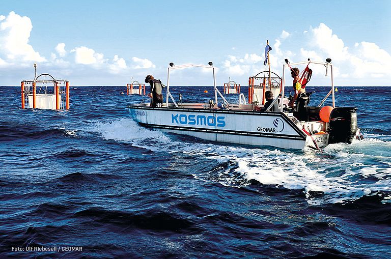 Unser Bild des Monats zeigt das Arbeitsboot „Wassermann“ vor der Küste Gran Canarias auf dem Weg zu den Kieler KOSMOS-Offshore-Mesokosmen. Jede einzelne dieser Versuchsanlagen schließt 55 Kubikmeter natürliches Meerwasser ein. Mit diesem Wasserkörper können Wissenschaftlerinnen und Wissenschaftler Experimente zu zukünftigen Umweltbedingungen durchführen. Sie können beispielsweise Ozeanversauerung und ihre Auswirkungen simulieren, den Auftrieb von Tiefenwasser nachstellen oder Technologien für Negative CO2-Emissionen auf Chancen und Risiken überprüfen. Während der oft mehrmonatigen Experimente müssen regelmäßig Proben aus den einzelnen Mesokosmen entnommen werden. Für diese Beprobungsfahrten ist der Wassermann eine zuverlässige und erprobte Plattform.