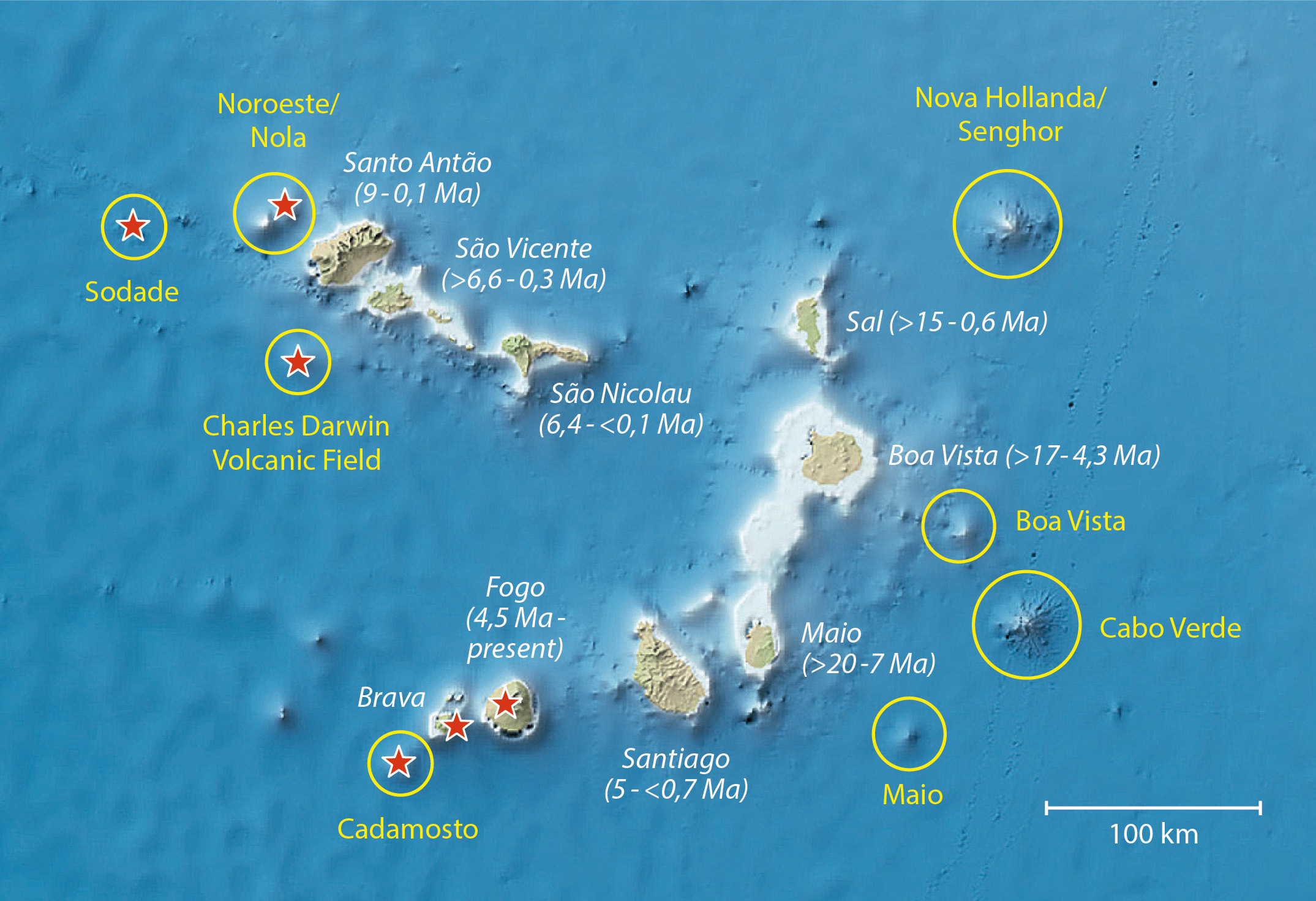 Karte des Kap Verde Archipels mit dem derzeit bekannten Alter der jeweiligen Inseln, welche von Ost nach West jünger werden, sowie der Seeberge (gelb) und der seismisch und/oder vulkanisch aktiven Regionen (rote Sterne) des Archipels. Der Meeresboden um Kap Verde ist 110-140 Millionen Jahre (Ma) alt. Quelle: GEOMAR, Bathymetrische Karte: GEBCO.