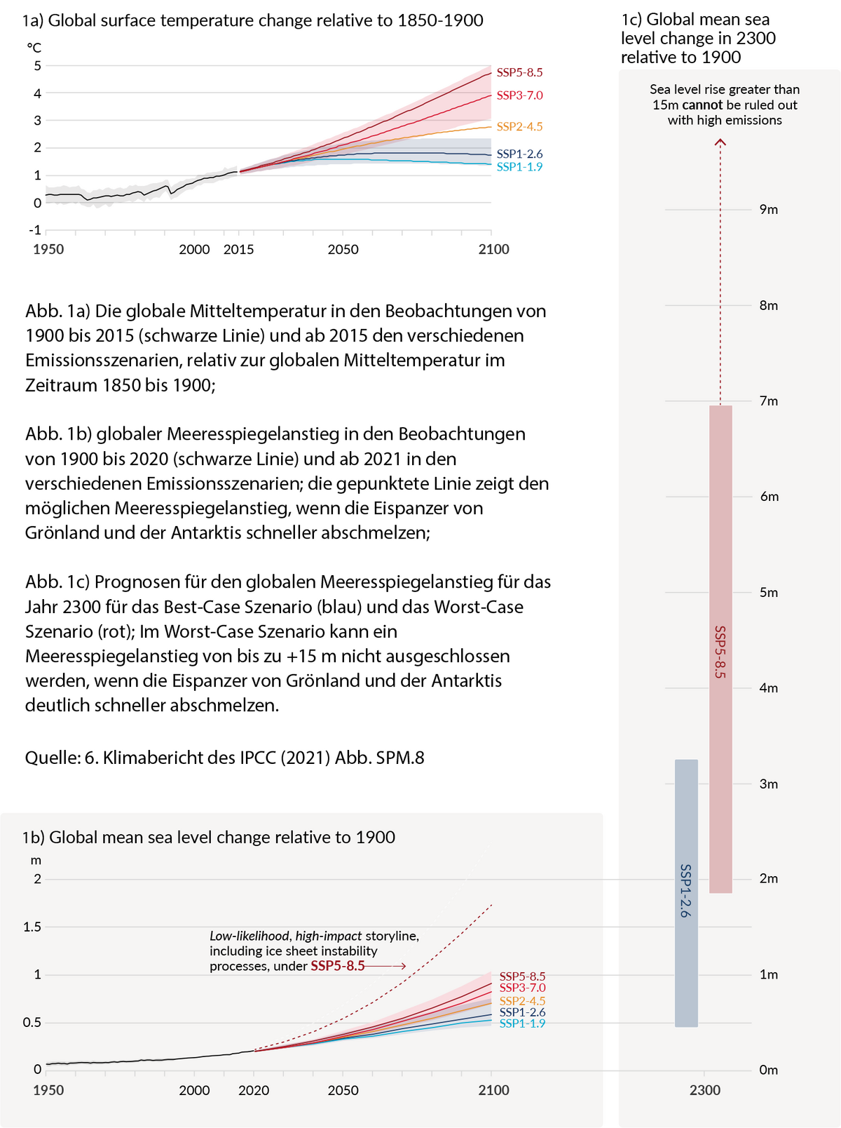 Da die Gletscher der Erde durch ihre Trägheit mit einer großen Zeitverzögerung auf die Klimaerwärmung reagieren, sind langfristige Prognosen zum Meeresspiegelanstieg wichtig, um uns unsere volle Verantwortung für zukünftige Generationen vor Augen zu führen. Je nachdem wie ambitionierten Klimaschutz wir machen, sagen die Prognosen des IPCC einen Meeresspiegelanstieg zwischen +0,5 m bis +15 m bis 2300 voraus (Abb. 1c).