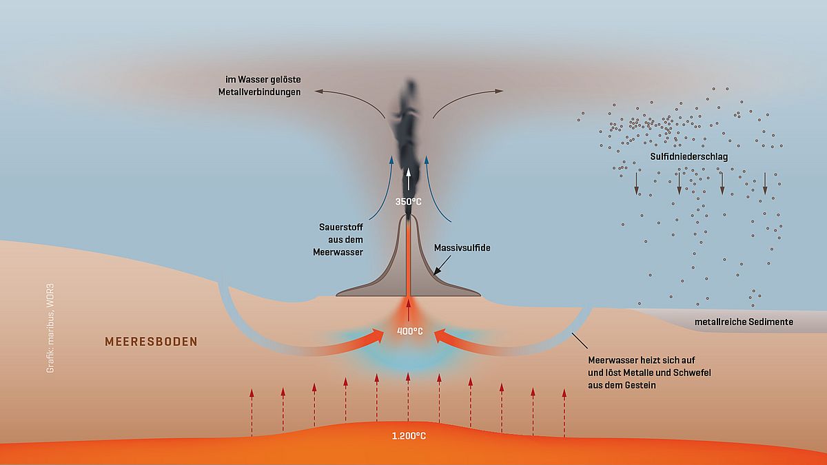 Im Jahr 1979 taucht das amerikanische Forschungstauchboot Alvin im pazifischen Ozean. Durch die kleinen Bullaugen der Druckhülle erblickte die Besatzung auf dem Meeresboden in rund 2.600 Metern Tiefe meterhohe Schlote, aus denen scheinbar schwarze Rauchwolken quollen. Die Wissenschaftler hatten die ersten hydrothermalen Quellen, sogenannte „schwarze Raucher“, entdeckt. Untersuchungen zeigten, dass sich rund um die Quellen Minerale ablagern und Vorkommen sogenannter Massivsulfide bilden. Inzwischen sind mehr als 390 Vorkommen in allen Ozeanen bekannt, wobei es aber gewaltige Unterschiede in der Größe der Vorkommen gibt. Hydrothermalquellen sind aber nicht nur Rohstofflieferant, sondern auch ein außergewöhnlicher Lebensraum.