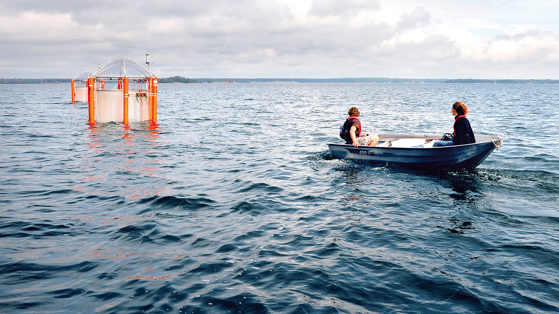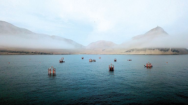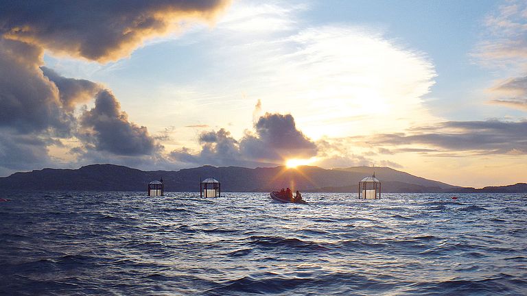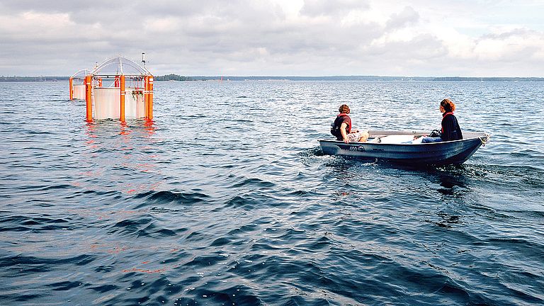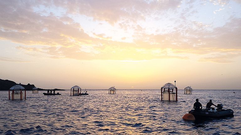 Wie reagieren komplexe marine Lebensgemeinschaften über einen längeren Zeitraum auf die Ozeanversauerung? Wie wirken sich die Reaktionen einzelner Spezies, aber auch der gesamten Planktongemeinschaft auf die Stoff- und Energiekreisläufe im Meerwasser aus? Wie beeinflussen diese Wechselwirkungen das marine Nahrungsnetz? Die KOSMOS (Kiel Offshore Mesocosms for Future Ocean Simulations) Mesokosmen ermöglichen einen Blick in den Ozean der Zukunft: In den abgeschlossenen Welten können zukünftige Bedingungen simuliert und die Reaktionen mariner Lebensgemeinschaften wie in riesigen Reagenzgläsern untersucht werden.
