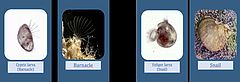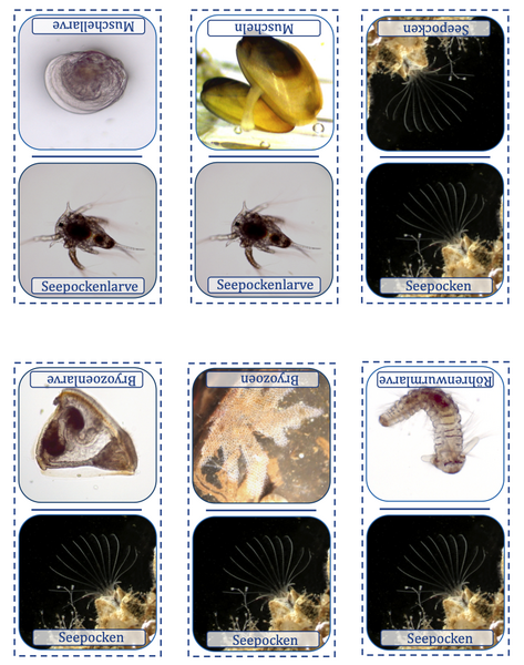 Eine andere Art von Domino. Das Larvenstadium einer Art wird jeweils mit dem Erwachsenenstadium zusammengebracht. Es sind nur gängige Fouling-Organismen berücksichtigt.