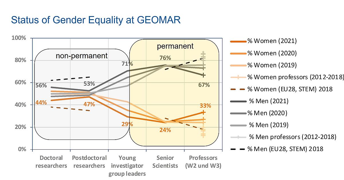 Die „Leaky Pipeline“ dokumentiert den Verlust an weiblichen Beschäftigten mit steigendem Karrierelevel. Auf der Ebene der Promotionen und der befristeten Postdoc-Stellen besteht bereits ein ausgeglichenes Geschlechterverhältnis; der Frauenanteil liegt auf dieser Stufe bei 44 bzw. 47 Prozent (Stand: 31.12.2021). Bei den unbefristeten Wissenschaftler:innen- und Professor:innenenstellen ist der Anteil der Frauen jedoch stark unterrepräsentiert (24 bzw. 33 Prozent).