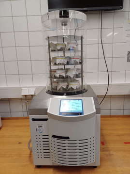 Die Becher mit den tiefgefrorenen Proben werden mit einem fusselfreien Tuch bedeckt und im Gefriertrockner einem Hoch-Vakuum ausgesetzt. Das resublimierte Wasser wird im Gerät in einer Kältefalle bei -60 Grad gebunden. Die Gefriertrocknung dauert mehr als 24 Stunden. Die Proben behalten ihre Gestalt und Farbe. Sie sind nach der Trocknung von zahlreichen mikroskopischen Rissen durchzogen, die um gröbere Komponenten herum verlaufen. Das Salz aus dem Porenwasser ist als winzige Kristalle oder Beläge in diesen Hohlräumen verblieben. Werden gefriergetrocknete Proben mit destilliertem Wasser bedeckt, so zerfällt das Sediment in wenigen Augenblicken zu kleinen Schuppen und lässt sich gut und zügig schlämmen, ohne dabei viel Wasser zu verbrauchen.
