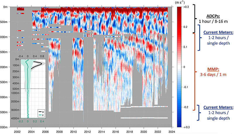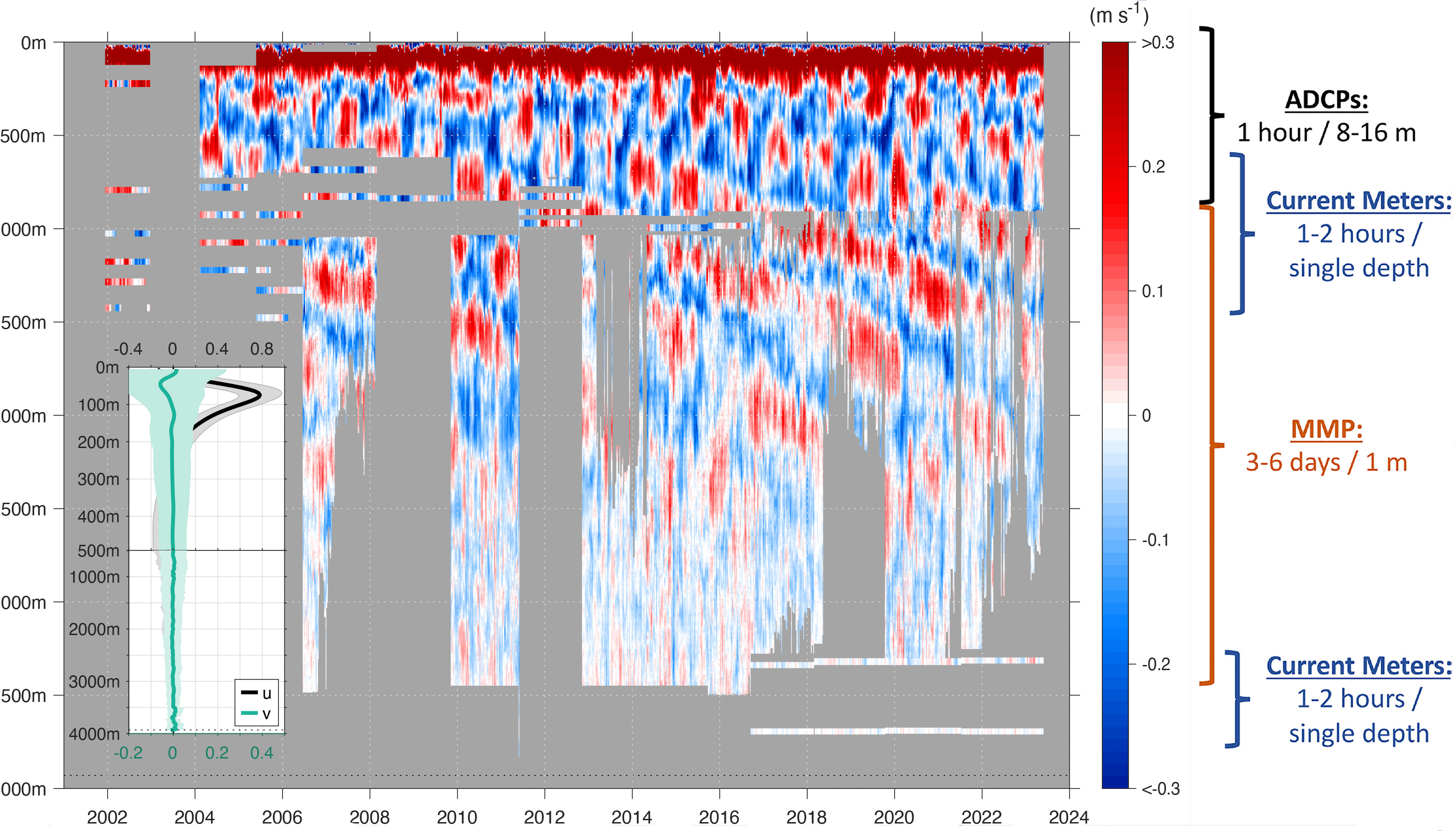 The unique full depth velocity time series at this location has been used to study various phenomena: