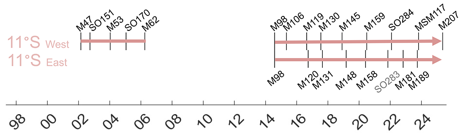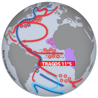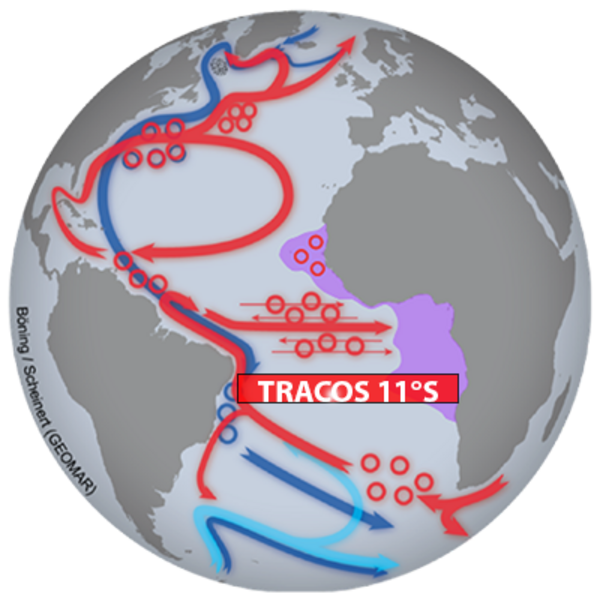 The TRACOS (Tropical Atlantic Circulation and Overturning at 11°S) array at 11°S between Brazil and Angola consists of ship and moored observations as well as pressure inverted echosounders at the western and eastern boundary. It is located in the tropical Atlantic where the upper-ocean circulation is a complex superposition of thermohaline and wind-driven flows. The zonally and vertically integrated upper-ocean meridional flow is associated with the upper branch of the Atlantic Meridional Overturning Circulation (AMOC) — a major component of the global climate system. In the tropics, the northward AMOC flow is superimposed by the shallower overturning associated with the wind-driven Subtropical cells (STCs). One of the key regions in the tropical Atlantic is the western boundary current system off Brazil. This region serves as a crossroads for the meridional transfer of mass, heat, and salt between the Northern and Southern hemisphere. The eastern boundary serves as a gateway for equatorial variability in the Benguela upwelling system: The TRACOS array consists of moorings at the western and eastern boundary and bottom pressure measurements on both sides of the basin in 300m and 500m depth.