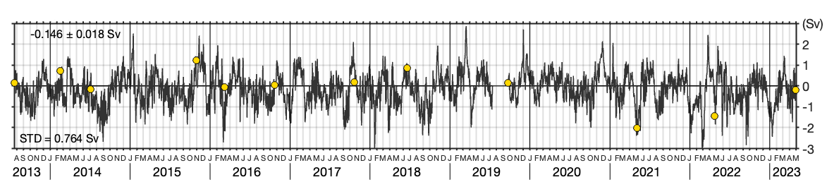 | Transport time series of the Angola current meridional transport for the upper 200 m depth. Yellow dots indicate ship section transports. Update from Kopte et al. (2017). |
