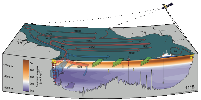 At the eastern boundary, 11°S is located in an upwelling system, in which sea surface temperatures drop seasonally and nutrients are brought into the euphotic zone, sustaining a highly productive ecosystem. The Angola current itself is characterized by a weak mean but variable flow.