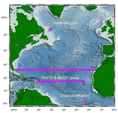 Auch im Nordatlantik gibt es derzeit eine Reihe von langfristigen Beobachtungssystemen (Abb. 1), die - zum großen Teil - durch unsere eigene Gruppe von Wissenschaftlern in Zusammenarbeit mit mehreren internationalen Partnern und dem weltweiten Argo Float System betrieben und analysiert werden. Diese Systeme sind sehr gut für die Überprüfung und Analyse der dekadische Vorhersage-Modelle geeignet, und einzelne Komponenten werden bereits jetzt für genau diesen Zweck verwendet. Allerdings sind die verfügbaren Daten noch nicht in ihrer ganzen Breite und Tiefe für die systematische Verifizierung der ozeanischen Vorhersageensembles benutzt worden.
