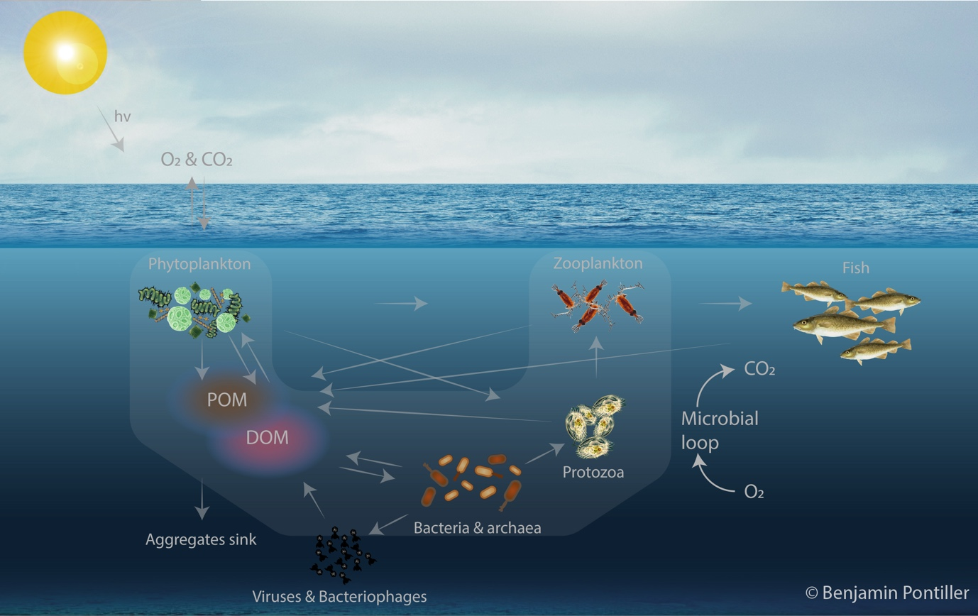 Unsere Abteilung befindet sich an der Schnittstelle zwischen Mikrobiologie und Biogeochemie und untersucht mikrobielle Prozesse, die biogeochemische Kreisläufe in der Meeresumwelt antreiben - vom offenen Ozean bis zu den Küstengebieten. Wir setzen fortschrittliche Technologien wie Genomsequenzierung, Massenspektrometrie und Modellierung ein, um mikrobielle Genetik, Stoffwechselprozesse und ökologische Interaktionen zu untersuchen. Wir versuchen zu verstehen, wie Mikroorganismen die Zusammensetzung organischer Stoffe beeinflussen, den Fluss von Treibhausgasen modulieren und wichtige Nährstoffe umwandeln. Unsere Forschung untersucht zum Beispiel die Reaktionen von Mikroorganismen auf Umweltfaktoren wie Temperatur, Nährstoffmenge und -qualität und untersucht, wie diese Wechselwirkungen die Gesundheit der Ozeane und die biogeochemischen Kreisläufe beeinflussen. Unsere Arbeit betont auch die gegenseitige Abhängigkeit von marinen Mikroorganismen und organischen Stoffen und untersucht, wie mikrobielle Gemeinschaftsstrukturen und Stoffwechselfunktionen das sich verändernde Klima und die Ökosysteme der Erde beeinflussen und von ihnen beeinflusst werden. Durch Feldstudien und kontrollierte Laborexperimente erhalten wir Einblicke in die ökologische Rolle, die genetische Vielfalt und die Anpassungsfähigkeit des Meeresmikrobioms unter Stressfaktoren wie Erwärmung, Versauerung, sich ausbreitende Sauerstoffminimumzonen und Verschmutzung. Im Folgenden stellen wir Schlüsselprojekte vor, die beispielhaft für unser Engagement sind, das Wissen über den Einfluss des Meeresmikrobioms auf globale biogeochemische Prozesse, die Dynamik von Ökosystemen und die Widerstandsfähigkeit gegenüber dem Klima zu erweitern.