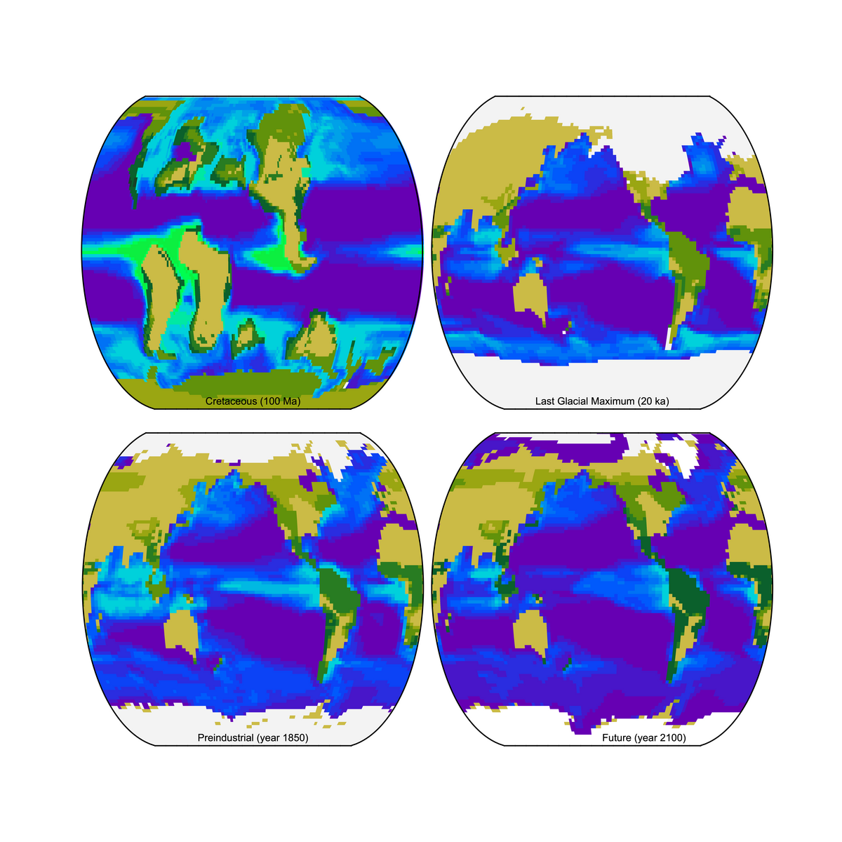 • Christopher Somes uses an isotope-enabled Model of Ocean Biogeochemistry and Isotopes (MOBI) within an Earth System Model of intermediate complexity (UVic) to compare directly to sedimentary records (e.g. δ15N and δ13C) to constrain marine biogeochemical processes in the past (e.g. marine nitrogen and iron budgets/inventories and their impact on biological carbon pump, (de)oxygenation). This has been applied during the Last Glacial Maximum (21,000 years ago) and future applications will focus on the last deglaciation (~21,000 to ~12,000 years ago) and Cretaceous Ocean Anoxic Events (~90 million years ago).
