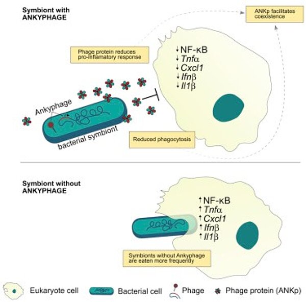 Während jüngste Studien eine große Vielfalt in der Virosphäre aufgedeckt haben, besteht die neue Herausforderung darin zu verstehen, wie Phagen die Wirt-Mikroben-Interaktionen modulieren. Wir kombinieren virale Metagenomik mit funktionellen Assays, um das Zusammenspiel zwischen Phagen, bakteriellen Symbionten und marinen Schwämmen zu untersuchen. Obwohl Schwämme massive Wassermengen durch ihre ständig arbeitenden Filterapparate verarbeiten, haben wir kürzlich gezeigt, dass sie artspezifische und sogar individuell einzigartige virale Signaturen beherbergen, die sich von anderen Umgebungen unterscheiden. Wir haben ferner ein Ankyrin-Protein (ANKp) entdeckt, das auf einem Symbiontenphagen kodiert ist und bei heterologer Expression die eukaryotische Immunantwort gegen Bakterien moduliert, wie in Makrophagen-Infektionsassays bestätigt wurde. Wir stellen die Hypothese auf, dass diese Symbiontenphagenproteine die Koexistenz im Multispezies-Wechselspiel zwischen Phagen, mikrobiellen Symbionten und Schwämmen in einer Weise erleichtern, die sich auf andere Wirt-Mikroben-Assoziationen ausdehnen kann. Interessanterweise scheinen diese "Ankyphagen" in anderen Wirts-Mikroben-Assoziationen, einschließlich des Menschen, weit verbreitet zu sein.