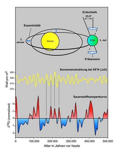 Neben der Zirkulation und Vermischung von Wassermassen sind es vor allem die globalen, klimabedingten Schwankungen in der terrestrischen Biomasse, sowie in der Produktion von mariner Biomasse und ihrem Transfer in die Tiefsee, die die Variationen im δ13C des Ozeans bestimmen. Terrestrische und marine Biomasse ist mit δ13C -Werten von -18 bis -28 ‰ reich an 12C gegenüber δ13C Meerwasserwerten nahe 1 ‰. Waehrend der Kaltstadien war der Transfer von 12C -reicher Biomasse in den tiefen Ozean höher als in den Warmstadien. Im Tiefenwasser führte dies durch die Oxidation von organischem Kohlenstoff zu einem glazialen Anstieg im CO2 Gehalt, und zu niedrigeren δ13C Werten sowie zu einer atmosphaerischen CO2 Abnahme.