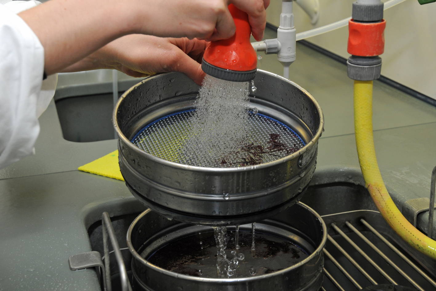 Mit Äthanol konservierte und eingefärbte Proben werden mindestens zwei Wochen gelagert, um eine vollständige Färbung der vormals lebenden Individuen zu erreichen. Bei der anschließenden Aufbereitung geben wir die Proben zuerst durch ein 2000 µm Sieb. Damit sollen Kiesel und andere große Partikel entfernt werden, die beim weiteren Schlämmen zerbrechliche Foraminiferengehäuse zermahlen würden. Die Fraktion >2000 µm wird auf dem Sieb mit einer Brause und Leitungswasser abgespült, bei 60°C getrocknet und aufbewahrt. Dann werden die Proben in ein 63 µm Sieb gegeben und mit einer Brause und Leitungswasser vorsichtig gespült. Unter einem Mikroskop wird von Zeit zu Zeit geprüft, ob die Foraminiferen ausreichend gereinigt sind. Der Siebrückstand wird nach dem Schlämmen unter Äthanol (mind. 70 %) aufbewahrt, wenn zerbrechliche Sandschaler-Arten untersucht werden sollen. Sonst wird die Fraktion 63 – 2000 µm bei 60°C getrocknet, gewogen und für weitere Untersuchungen aufbewahrt.