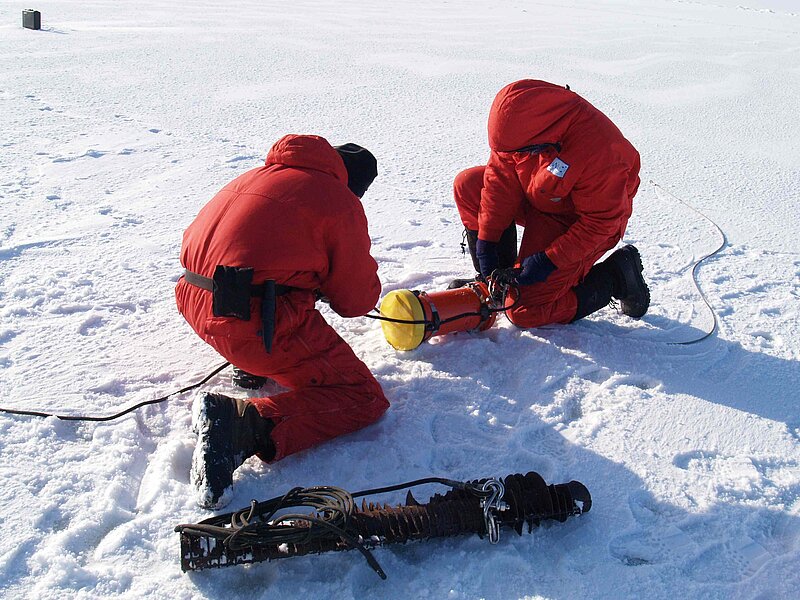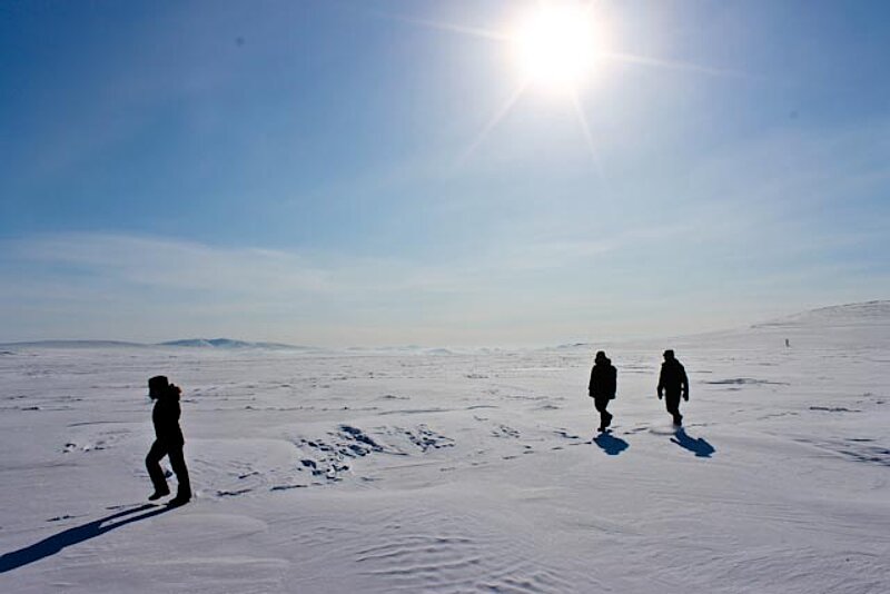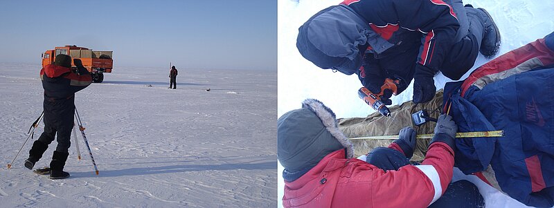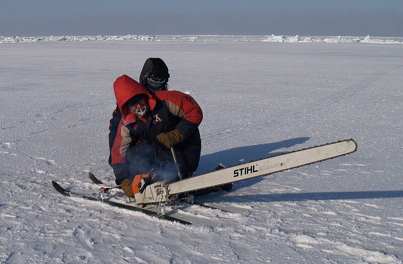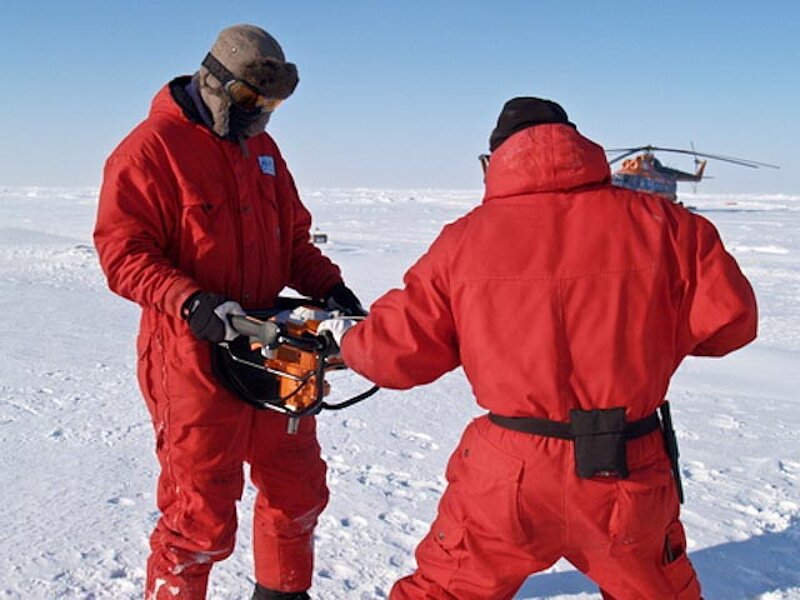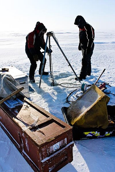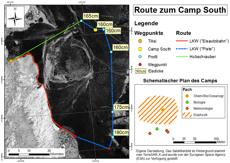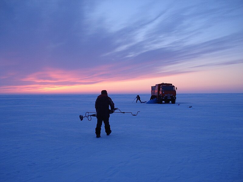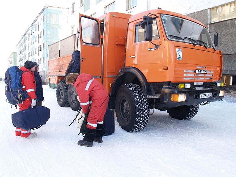 Die Idee, fünf Personen in einem LKW für mehrere Tage auf das Meereis zu schicken, war ganz praktischer Natur. Da die an der Expedition teilnehmenden Eisphysiker für ihre Experimente viel Zeit benötigen und entsprechend häufige Hubschrauberflüge zu viel Geld gekostet hätten, hat sich die Expeditionsleitung dazu entschlossen, ein kleines Team in einem speziell für die Arktis ausgerüsteten 12-Tonner zum "Camp South" zu schicken. Der Name rührt sehr simpel von der geographischen Position: Das südlichste der drei Camps, in denen wir arbeiten. Für diese Tour lag meine Aufgabe in der Vorbereitung des Aufbaus der meteorologischen Stationen und der Durchführung einiger Messungen der Eisdicke.