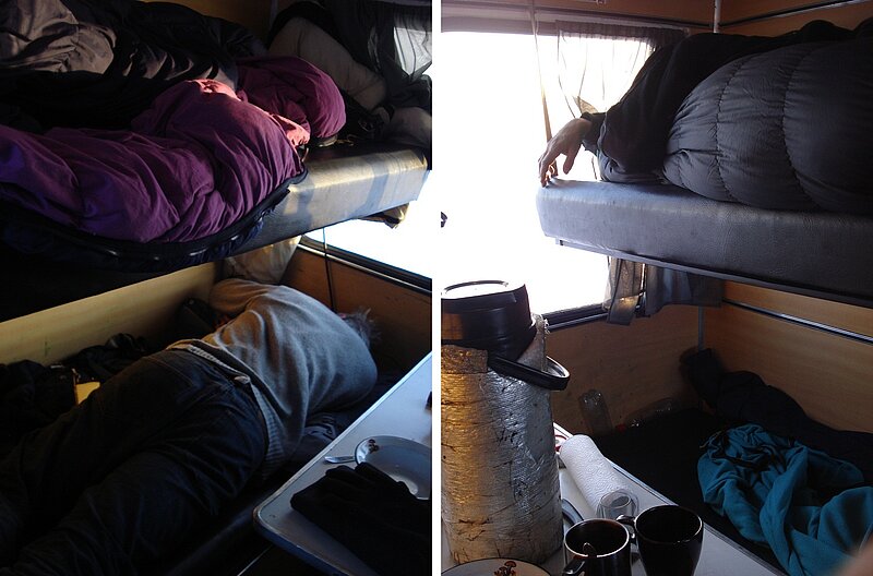 Gegen Mitternacht ging es dann ins Bett. Im Wohnteil des LKWs hatten vier von uns Platz. Konstantin, unser Fahrer, hatte sein „Einzelzimmer“ im Führerhäuschen. Geschätzt war die Wohnfläche 2,5x3 m, und die Betten waren so schmal, dass man sich nicht einfach mal umdrehen konnte. Einer unbedachten Bewegung im Schlaf wäre unweigerlich ein Sturz auf den Frühstückstisch gefolgt ... Frühstück im Bett sozusagen. Trotz dieses Risikos und des die ganze Nacht durchlaufenden Motors (um es in der Kabine warm zu halten) haben all gut geschlafen, und am nächsten Tag ging es um 6.30 Uhr los.