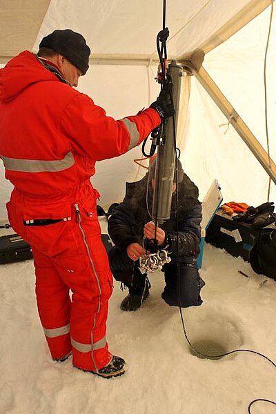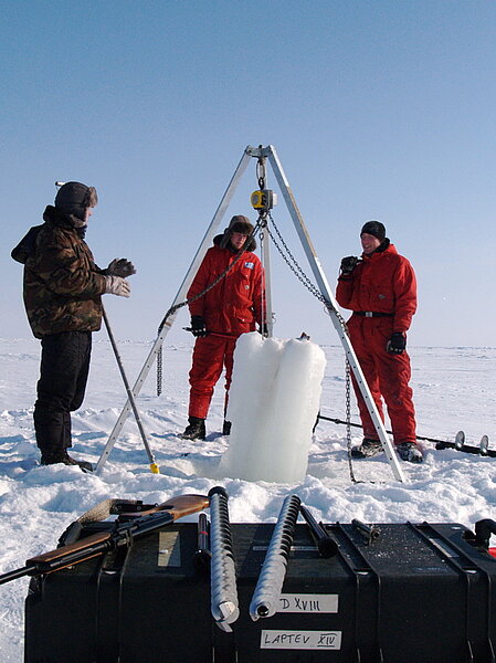 Mittwoch war dann noch einmal volles Programm. Heidi hat beim allmorgendlichen Telefonat Eisbohrkerne bestellt, die wir von Hand ziehen mussten. Da das ein Weilchen dauert und auch einiges an Muskelkraft kostet, haben Sasha Gukov und ich gleich nach dem Frühstück damit angefangen. Als der zweite Kern fast fertig gebohrt war, kam der Hubschrauber eingeschwebt. Nachdem ich einige Geburtstagsglückwünsche entgegen nehmen durfte, folgten dann weitere Experimente und die Endmontage der Wetterstationen. Insgesamt eine ansehnliche Station mit vertretener Geochemie, Biologie, Meteorologie, Ozeanographie und Eisphysik. Da der LKW schon etwas früher losfahren musste (um noch im Hellen zurück in Tiksi zu sein) und Professor Alfred Helbig mich noch für die letzten Handgriffe an den Wetterstationen gebraucht hat, konnte ich mit dem Hubschrauber zurückfliegen. Da anstatt sechs bis sieben Stunden im LKW nur ca. 30 Minuten im Hubschrauber zu verbringen waren, konnte ich mir das schönste Geburtstagsgeschenk schon vor den anderen erfüllen: Nach vier Tagen endlich eine heiße Dusche!