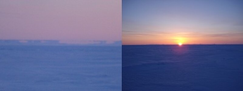 Mit den ersten Arbeiten wurde begonnen, und in der Ferne gab es erst einige Luftspiegelungen zu bewundern und später einen schönen Sonnenuntergang. Luftspiegelungen sind an große vertikale Temperaturgradienten in der bodennahen Luftschicht gebunden. In diesem Fall kühlte die Schneeoberfläche sehr stark aus und die Lufttemperatur nahm mit der Höhe zu. Dies war mit einer entsprechenden starken vertikalen Änderung der Luftdichte verbunden. Die Lichtstrahlen verlaufen nun in gekrümmten Bahnen. Dadurch werden entfernte Objekte unter einem anderen Blickwinkel wahrgenommen.