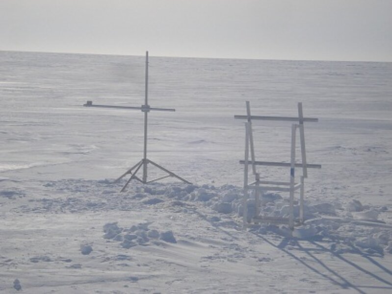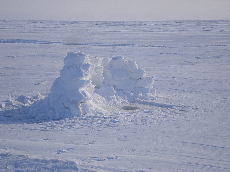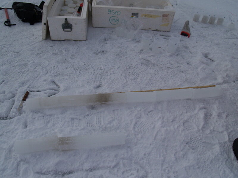 Am Sonntag, den 1.4.2012, fuhren wir um 8:30 Uhr unter blauem Himmel los. Die ersten zwei bis drei Stunden führten uns südwärts über eine Art Eisautobahn, die von Einheimischen als Verbindung zwischen verschiedenen Ortschaften genutzt wird. Natürlich ist das keine Autobahn im klassischen Sinne, aber verhältnismäßig gut und einfach zu befahren (mit bis zu 60 km/h). Der Schlenker nach Süden war nötig, um einige Eisrücken zu umfahren, die selbst einem so kräftigen LKW Probleme machen können. Als wir dann die glatte Piste verließen, ging es sozusagen über die Landstraße weiter. Zwar immer noch recht glatt, aber schon mit einigen Schneeverwehungen, die nicht ganz so einfach zu passieren waren. Hier ging es auch nur noch mit max. 15-20 km/h voran ... meist eher langsamer. Es wurde einige Male die Eisdicke gemessen ... immerhin ist man mit schwerem Gerät unterwegs und da will man schon wissen, ob das Eis auch stark genug ist, um die Last zu tragen. Unter dem Eis ist ja der Ozean, und schwimmfähig ist der LKW nun auch wieder nicht. Unsere Messungen lagen immer über 150 cm Eisdicke und somit in einem sicheren Bereich. Um zurück in unserem Arbeitsgebiet zu kommen, ging es dann wieder drei Stunden nach Norden. Dort angekommen haben wir eine für die Experimente günstige Stelle gesucht und dann den Daheimgeblieben Ankunft und Position gemeldet. Die Eisdicke betrug 170 cm und es waren -20°C Lufttemperatur.