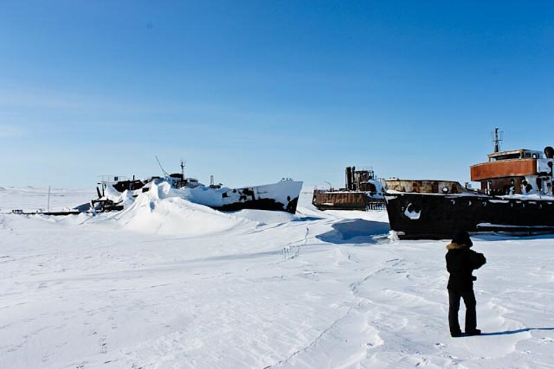 Igor und Leonid begannen mit ihren Vorbereitungen, und ich baute die Grundgerüste für die zwei Wetterstationen und unser kleines Kraftwerk auf. Letzteres bestand aus zwei Solar-Paneelen und einer Batterie zur Versorgung der Station für Messungen von Temperatur, Wind und verschiedener Strahlungsterme. Die zweite Station misst zusätzlich weitere Parameter wie Feuchte und Oberflächentemperatur. Redundante Messungen einiger Größen sind wichtig, da immer mal ein Sensor ausfallen kann. Oder, wie vor einigen Jahren geschehen, sich ein Eisbär als Hobbymeteorologe versucht und dabei leider nicht alles ganz funktionsfähig zurückgelässt. Seitdem werden die Stationen mit Diesel eingerieben. Laut den Einheimischen soll das ganz gut helfen. Gegen akuten Eisbär-Besuch war Konstantin, der neben seiner Tätigkeit als Fahrer auch Jäger ist, mit einem Gewehr bewaffnet. Zuerst hätten wir uns allerdings in den LKW zurückgezogen ... man möchte ja als Polarforscher Knut möglichst in Ruhe lassen. Immerhin sind wir in seinem Lebensraum ... überlegen Sie mal, bei Ihnen würde jemand im Garten stehen, und wenn Sie gucken, was der da so treibt, fängt der auch noch an zu schießen ... glücklicherweise kam es aber zu keinerlei Zwischenfall.