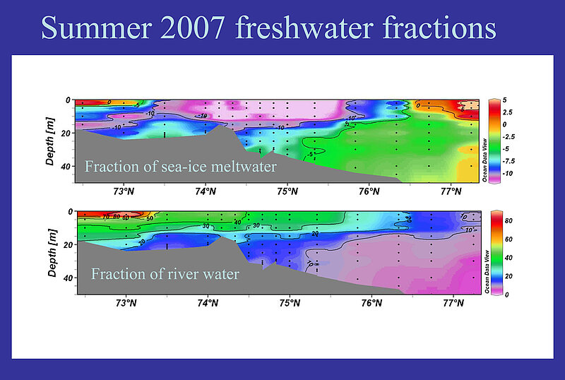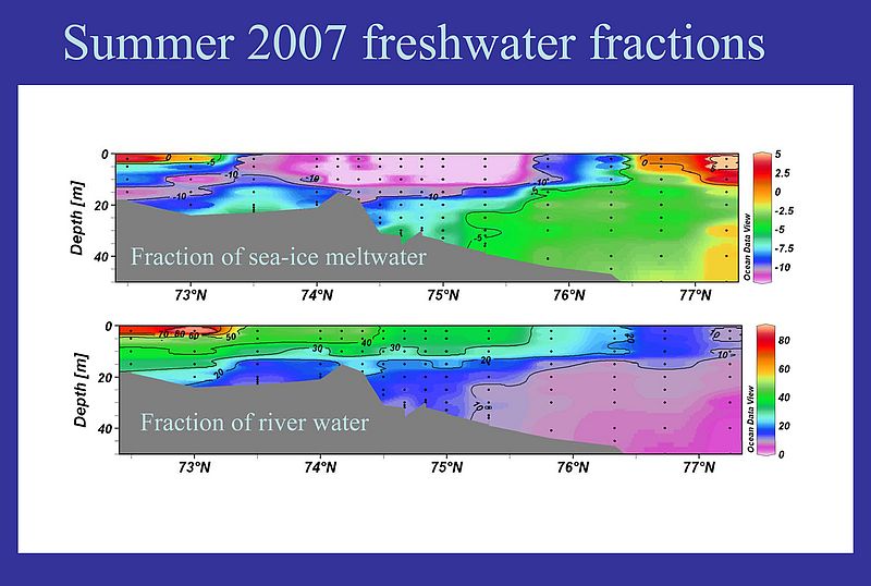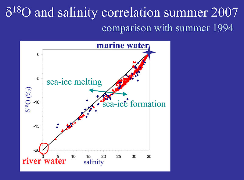 Der Zustrom der Wassermassen von den sibirischen Schelfgebieten, der die ausgeprägte arktische Halokline (Übergangszone zwischen dem salzarmen und leichten Oberflächenwasser und unterlagernden salzreichem Tiefenwasser) erhält, soll quantifiziert werden. In der Laptewsee-Polynja soll mit stabilen Sauerstoffisotopen (delta18O) die Bildung der für die arktische Halokline relevanten Wassermassen untersucht werden. Die salzreichen Wassermassen, welche durch Meereisbildung in der Polynja-Region der Laptewsee entstehen, sollen quantifiziert werden. Die gemeinsame Interpretation von Salzgehalten und delta18O-Werten, über die gesamte Wassersäule, erlaubt es, den Beitrag von Flusswasser und Meereisschmelzwasser abzuschätzen (Abb. 1). Mittels des Vergleiches der Winter- und Sommerverteilung sollen Budgets zur Gesamtmenge des gebildeten Meereises und der so gebildeten Wassermassen berechnet werden.