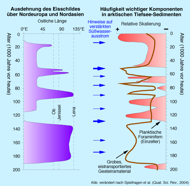 In Kooperation mit nationalen und internationalen Partnern werden am GEOMAR die Umwelteigenschaften im Arktischen Ozean in der jüngeren geologischen Vergangenheit untersucht. Auf vielen Expeditionen mit dem deutschen Forschungseisbrecher "Polarstern" und anderen eisbrechenden Forschungsschiffen wurden Sedimentkerne (Abb. 1) aus den arktischen Teilbecken, von untermeerischen Rücken und von zirkum-arktischen Kontinentalhängen gewonnen. Farbe, Zusammensetzung und geochemische Parameter der Sedimentabfolgen und ihrer Komponenten spiegeln die Veränderlichkeit wichtige Umwelteigenschaften des Ozeans wider. Am ehemaligen IFM-GEOMAR (heute GEOMAR) konnte daraus die Geschichte der arktischen Eisdecke, der obersten Wassermassen und des Süßwasserzustroms aus dem nördlichen Europa und Asien während der letzten 200.000 Jahre rekonstruiert werden (Abb. 2). Hohe Gehalte an planktischen Einzellern ("Foraminiferen") sind ein Anzeiger für eine zumindest saisonal aufgelockerte Eisdecke und einen Einstrom von Atlantikwasser in die Arktis, entsprechend dem heutigen "Golfstrom". Große Mengen von grobem, eistransportiertem Gesteinsmaterial in den Ablagerungen deuten auf entsprechend viele Eisberge, die von kalbenden großen Eisschilden abbrachen. Schließlich gibt die isotopische Zusammensetzung der kalkschaligen Plankton-Foraminiferen Hinweise auf den Zustrom von Süßwasser aus schmelzenden Gletschern und der Entleerung von Eisstauseen. Die gute zeitliche Übereinstimmung zwischen den maringeologischen Daten aus dem Arktischen Ozean und der von anderen Arbeitsgruppen an Land untersuchten Geschichte des Aufbaus und Zerfalls der Eisschilde (Abb. 2) weist auf eine enge klimatische Kopplung zwischen Land und Meer.