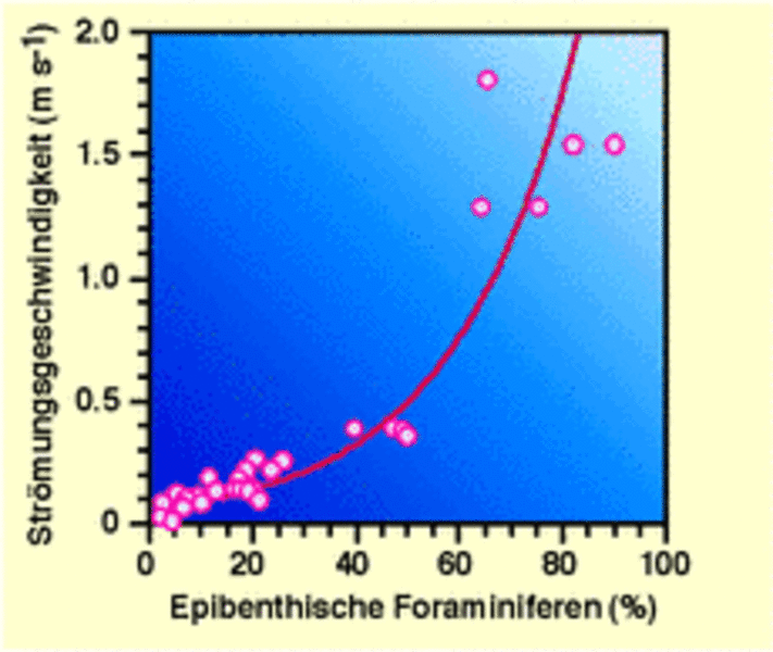 Verteilungs-Kennwerte wie das graphische Mittel (Mean) werden durch die Strömungsintensität bei der Ablagerung bestimmt. Epibenthische Foraminiferen zeigen eine enge Beziehung zum Sediment und dem hydrodynamischen Umfeld (Abb. 2). Sie sind häufiger und besiedeln höhergelegene Substrate, wo sie sich von suspendierten Partikeln ernähren, die mit der Bodenströmung herangetragen werden. Das graphische Mittel des sortierbaren Silts und der Anteil an erhöht lebenden Epibenthosforaminiferen werden zur Rekonstruktion von Bodenströmungen angewendet. Dabei zeigt der sortierbare Silt den kurzzeitigen Maximalwert und die Foraminiferengemeinschaft das langjährige Mittel an.