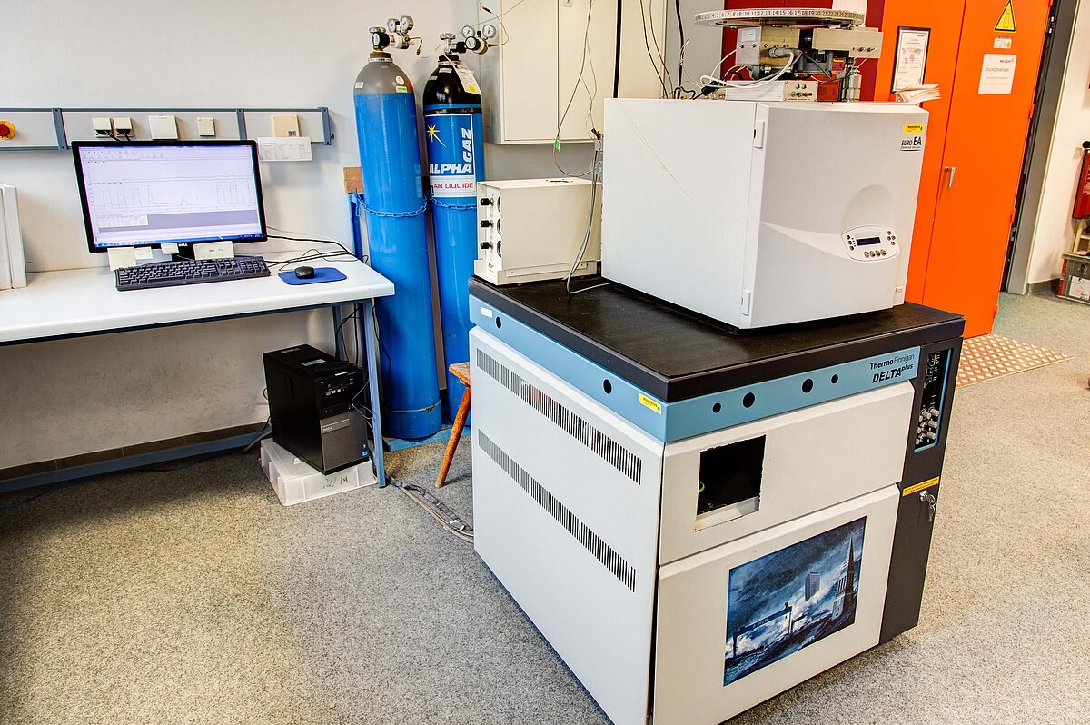Das Thermo Fisher Scientific Delta V Advantage ist ein Massenspektrometer zur Messung von Isotopenverhältnissen von ð15N und ð13C, das mit einem Thermo Fisher Scientific IsoLink-Elementaranalyser und einem Conflo IV gekoppelt ist. Das EA-IRMS ist für die Analyse von festen Materialien konfiguiert und misst ð15N und ð13C durch Verbrennung des Materials. Zusätzlich können die N- und C-Konzentrationen gleichzeitig in den Proben quantitativ bestimmt werden.